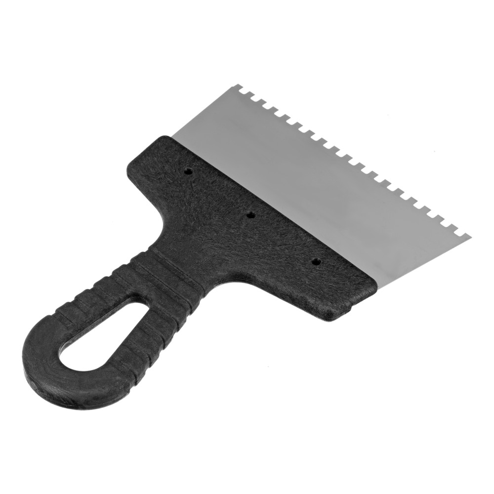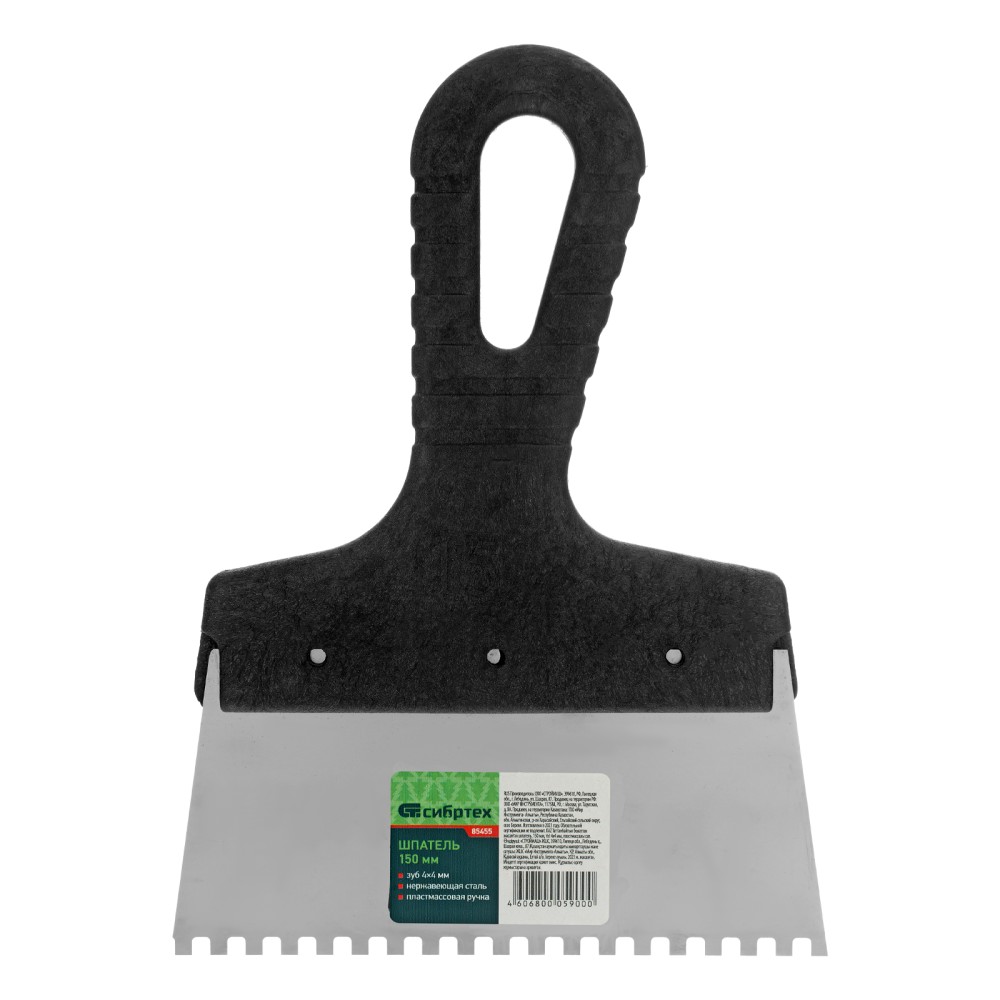 Шпатель Сибртех 85455 из нержавеющей стали, шириной 150 мм, с пластмассовой рукояткой и зубьями 4 х 4 мм, применяется во время проведения работ по укладке плитки, мозаики и т. д. Квадратные зубья облегчают нанесение клеевого состава, позволяя равномерно распределять его по поверхности. Зубья размером 4 х 4 мм рассчитаны на плитку площадью 50-100 см2.ПреимуществаУпругость — полотно быстро восстанавливает свою форму при изгибающих нагрузках.Коррозионная стойкость — рабочее полотно выполнено из нержавеющей стали.Комфортная эксплуатация — наклонная рукоятка облегчает нанесение и выравнивание раствора.Эргономичность — за счет рельефной текстуры рукоятка удобно ложится в руку и не выскальзывает из ладони.Удобное хранение — в рукоятке предусмотрено отверстие для подвешивания шпателя.