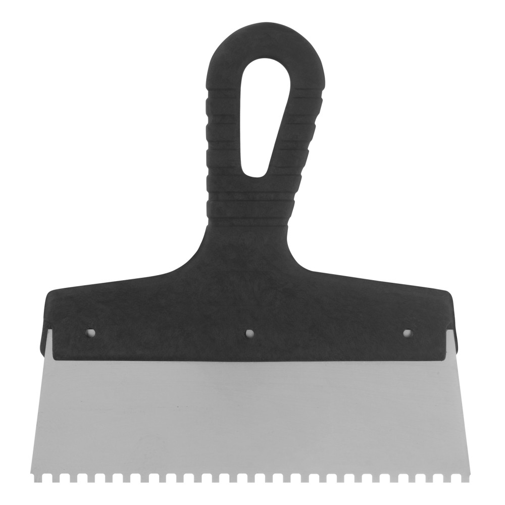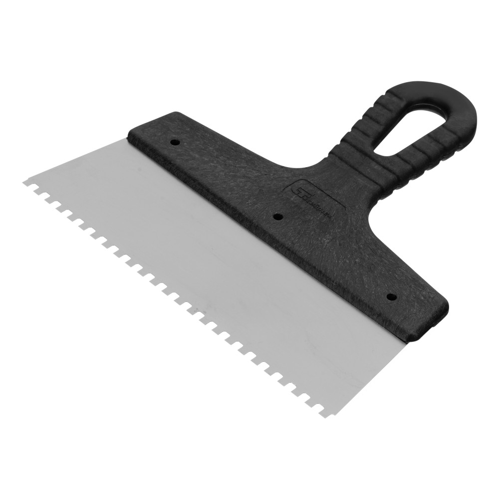 Шпатель Сибртех 85456 из нержавеющей стали, шириной 200 мм, с пластмассовой рукояткой и зубьями 4 х 4 мм, применяется во время проведения работ по укладке плитки, мозаики и т. д. Квадратные зубья облегчают нанесение клеевого состава, позволяя равномерно распределять его по поверхности. Зубья размером 4 х 4 мм рассчитаны на плитку площадью 50-100 см2.ПреимуществаУпругость — полотно быстро восстанавливает свою форму при изгибающих нагрузках.Коррозионная стойкость — рабочее полотно выполнено из нержавеющей стали.Комфортная эксплуатация — наклонная рукоятка облегчает нанесение и выравнивание раствора.Эргономичность — за счет рельефной текстуры рукоятка удобно ложится в руку и не выскальзывает из ладони.Удобное хранение — в рукоятке предусмотрено отверстие для подвешивания шпателя.