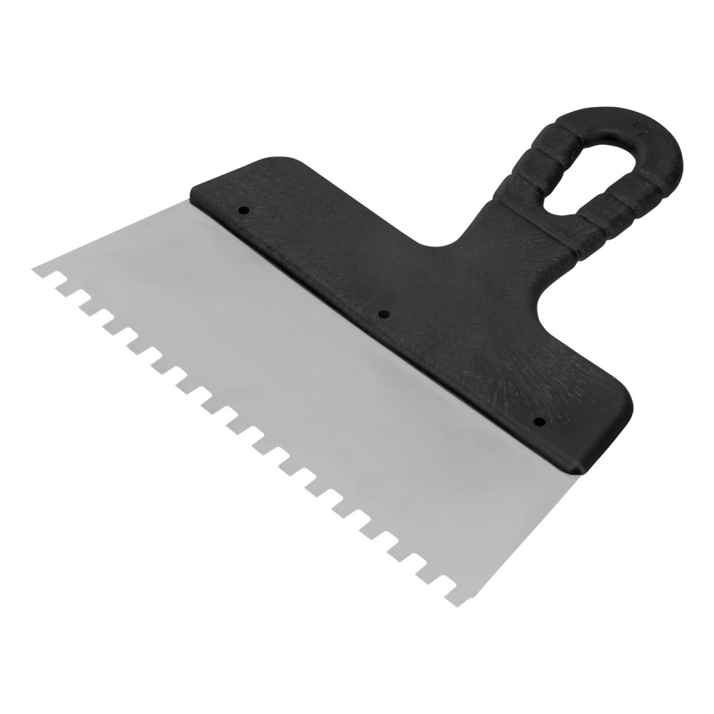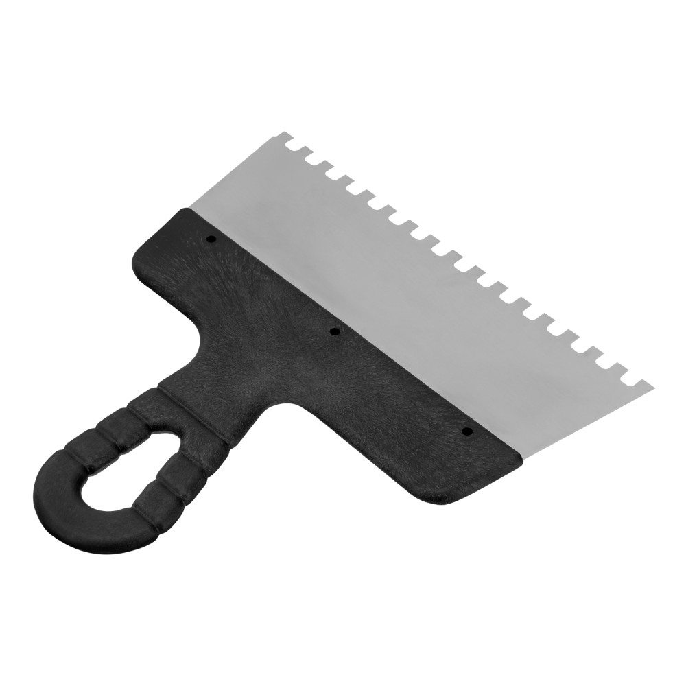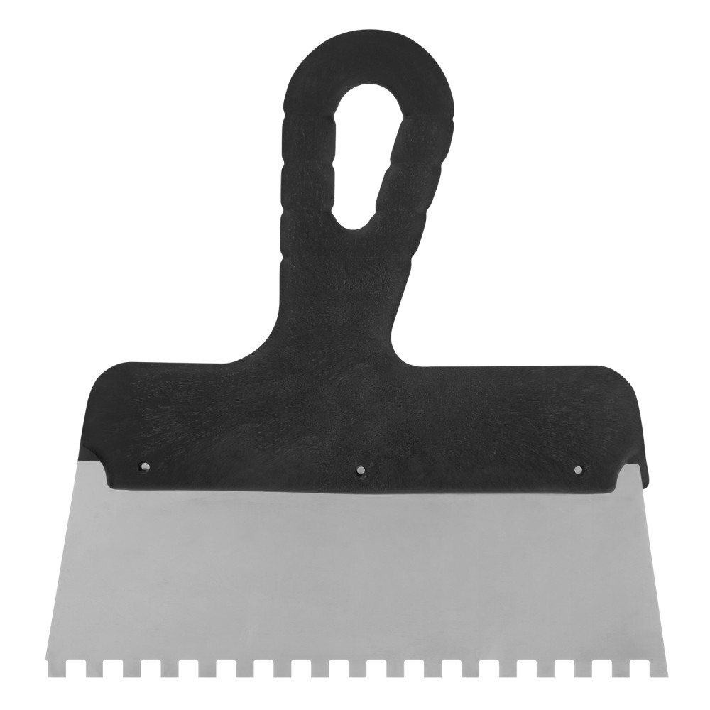 Шпатель Сибртех 85464 из нержавеющей стали, шириной 200 мм, с пластмассовой рукояткой и зубьями 6 х 6 мм, применяется во время проведения работ по укладке плитки, мозаики и т. д. Квадратные зубья облегчают нанесение клеевого состава, позволяя равномерно распределять его по поверхности. Зубья размером 6 х 6 мм рассчитаны на плитку площадью 100-400 см2.ПреимуществаУпругость — полотно быстро восстанавливает свою форму при изгибающих нагрузках.Коррозионная стойкость — рабочее полотно выполнено из нержавеющей стали.Комфортная эксплуатация — наклонная рукоятка облегчает нанесение и выравнивание раствора.Эргономичность — за счет рельефной текстуры рукоятка удобно ложится в руку и не выскальзывает из ладони.Удобное хранение — в рукоятке предусмотрено отверстие для подвешивания шпателя.