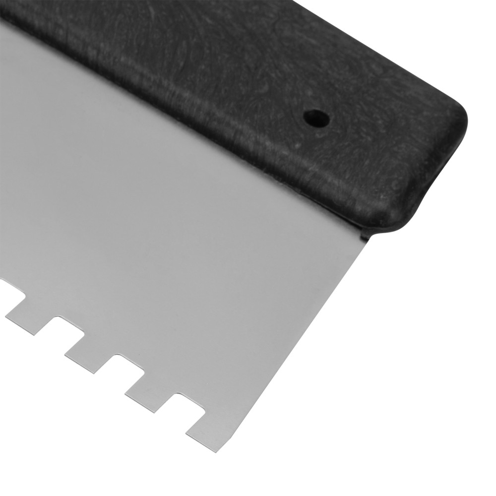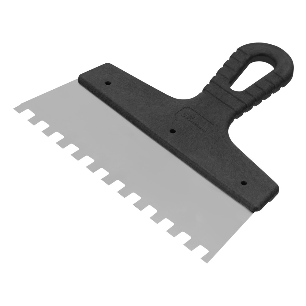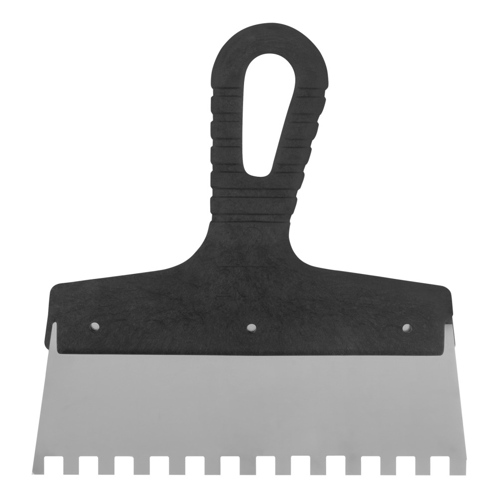 Шпатель Сибртех 85473 из нержавеющей стали, шириной 200 мм, с пластмассовой рукояткой и зубьями 8 х 8 мм, применяется во время проведения работ по укладке плитки, мозаики и т. д. Квадратные зубья облегчают нанесение клеевого состава, позволяя равномерно распределять его по поверхности. Зубья размером 8 х 8 мм рассчитаны на плитку площадью 400-900 см2.ПреимуществаУпругость — полотно быстро восстанавливает свою форму при изгибающих нагрузках.Коррозионная стойкость — рабочее полотно выполнено из нержавеющей стали.Комфортная эксплуатация — наклонная рукоятка облегчает нанесение и выравнивание раствора.Эргономичность — за счет рельефной текстуры рукоятка удобно ложится в руку и не выскальзывает из ладони.Удобное хранение — в рукоятке предусмотрено отверстие для подвешивания шпателя.
