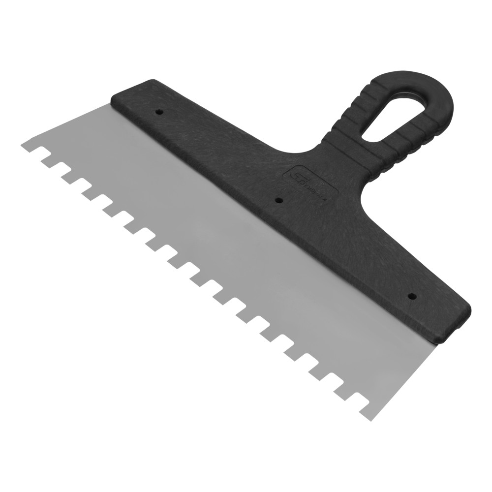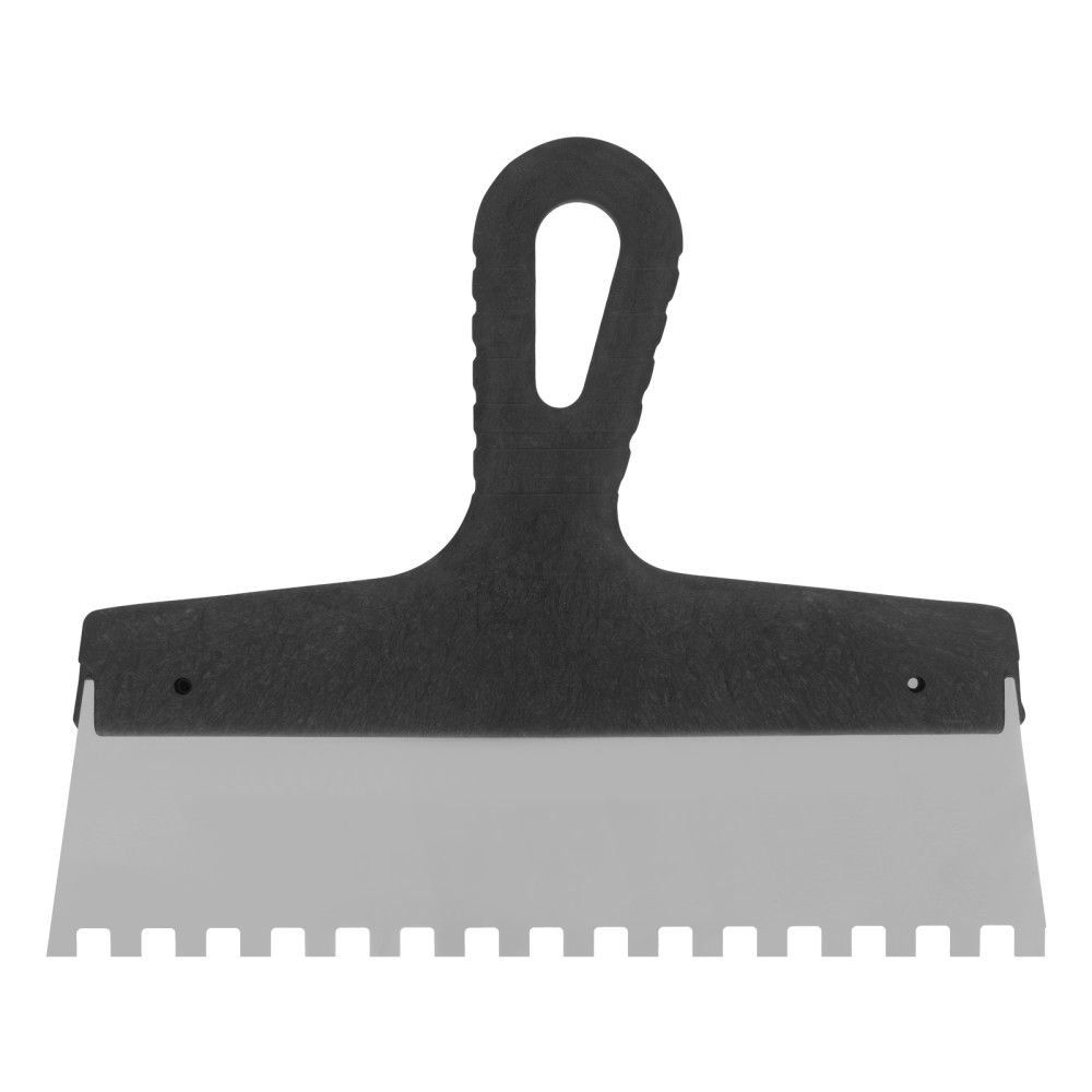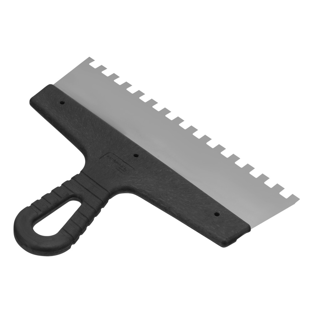 Шпатель Сибртех 85474 из нержавеющей стали, шириной 250 мм, с пластмассовой рукояткой и зубьями 8 х 8 мм, применяется во время проведения работ по укладке плитки, мозаики и т. д. Квадратные зубья облегчают нанесение клеевого состава, позволяя равномерно распределять его по поверхности. Зубья размером 8 х 8 мм рассчитаны на плитку площадью 400-900 см2.ПреимуществаУпругость — полотно быстро восстанавливает свою форму при изгибающих нагрузках.Коррозионная стойкость — рабочее полотно выполнено из нержавеющей стали.Комфортная эксплуатация — наклонная рукоятка облегчает нанесение и выравнивание раствора.Эргономичность — за счет рельефной текстуры рукоятка удобно ложится в руку и не выскальзывает из ладони.Удобное хранение — в рукоятке предусмотрено отверстие для подвешивания шпателя.