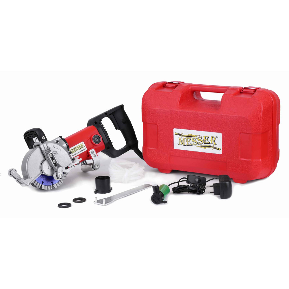 Также штроборез MESSER T1556 имеет возможность подачи воды в зону реза. Причем нет необходимости в наличии рабочего водопровода на объекте. Вода может подаваться прямо из ведра, канистры или другой емкости благодаря небольшому насосу, поставляемому в комплекте со штроборезом.