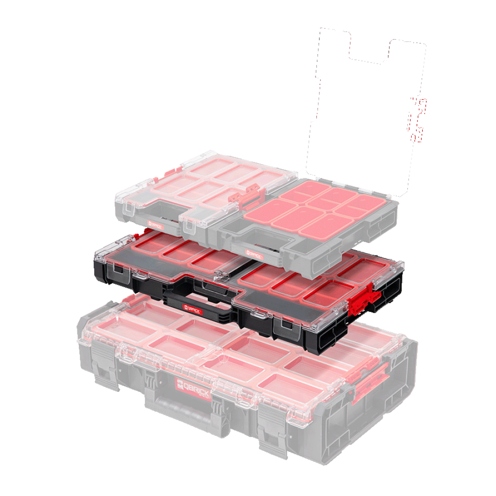 Стандартный органайзер L оснащен 10 ведрами для мелких принадлежностей, в том числе 8 меньшими и двумя длинными ведрами для хранения и транспортировки более длинных элементов вашей мастерской. Дополнительно содержимое органайзера защищено от попадания воды и пыли гибкой прокладкой, вмонтированной в крышку из поликарбоната.