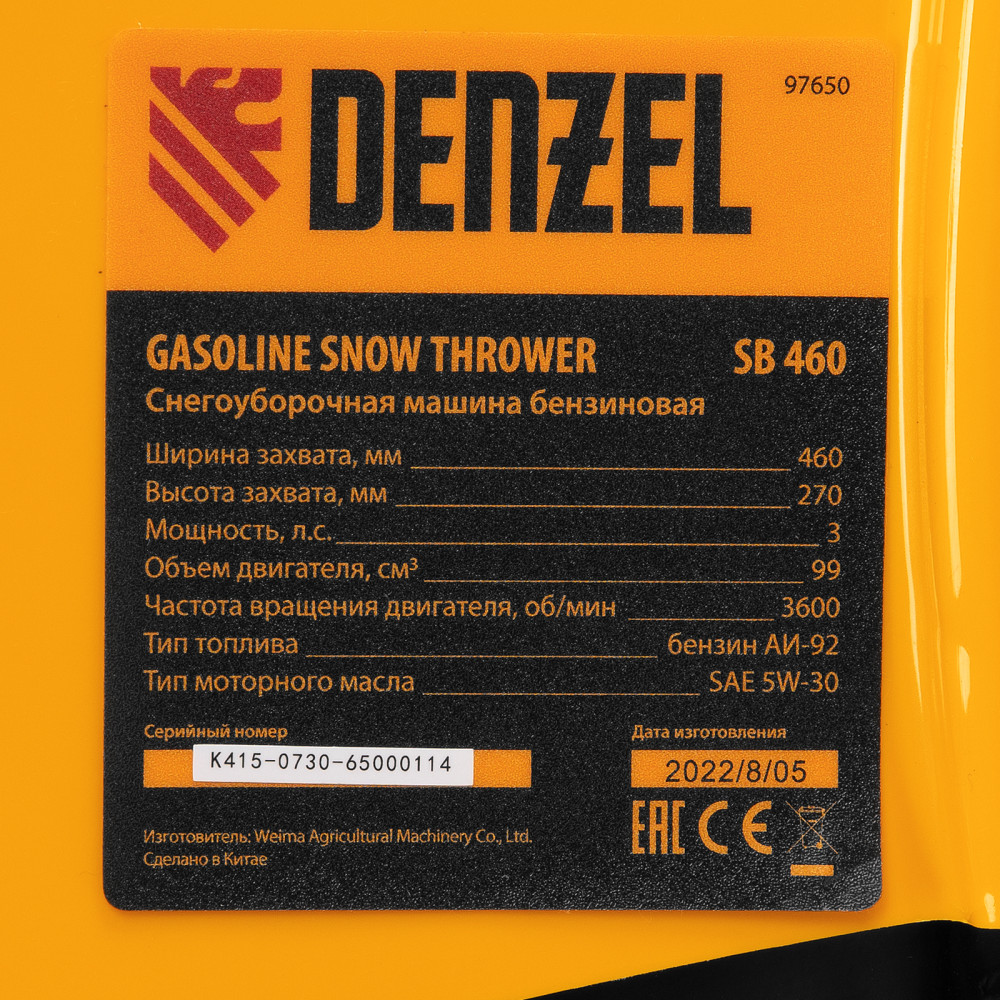 Бензиновая снегоуборочная машина SB 460, 99cc, ручной старт// Denzel