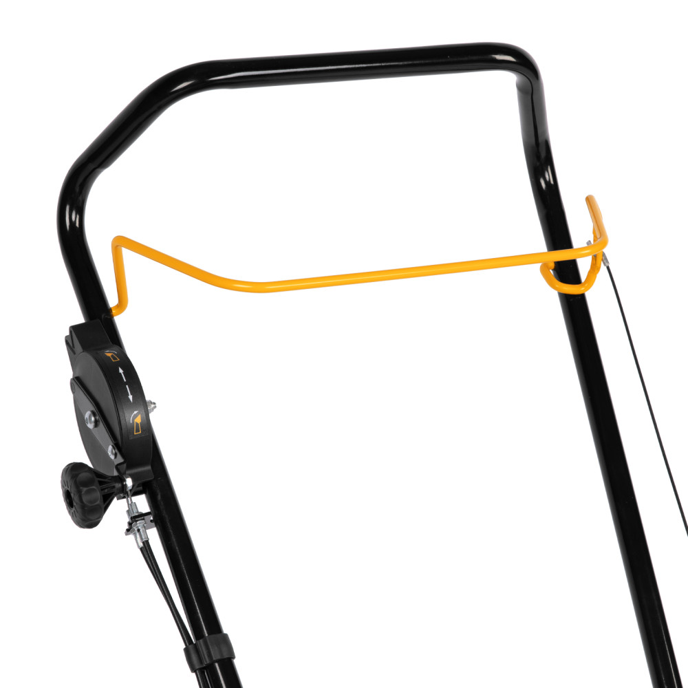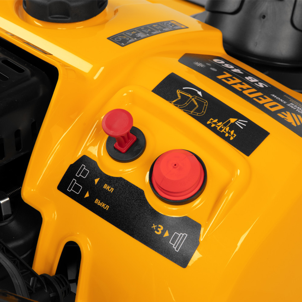 - Удобное управление — широкая рукоятка ручного старта облегчает запуск двигателя, для регулировки угла поворота желоба не нужно наклоняться.