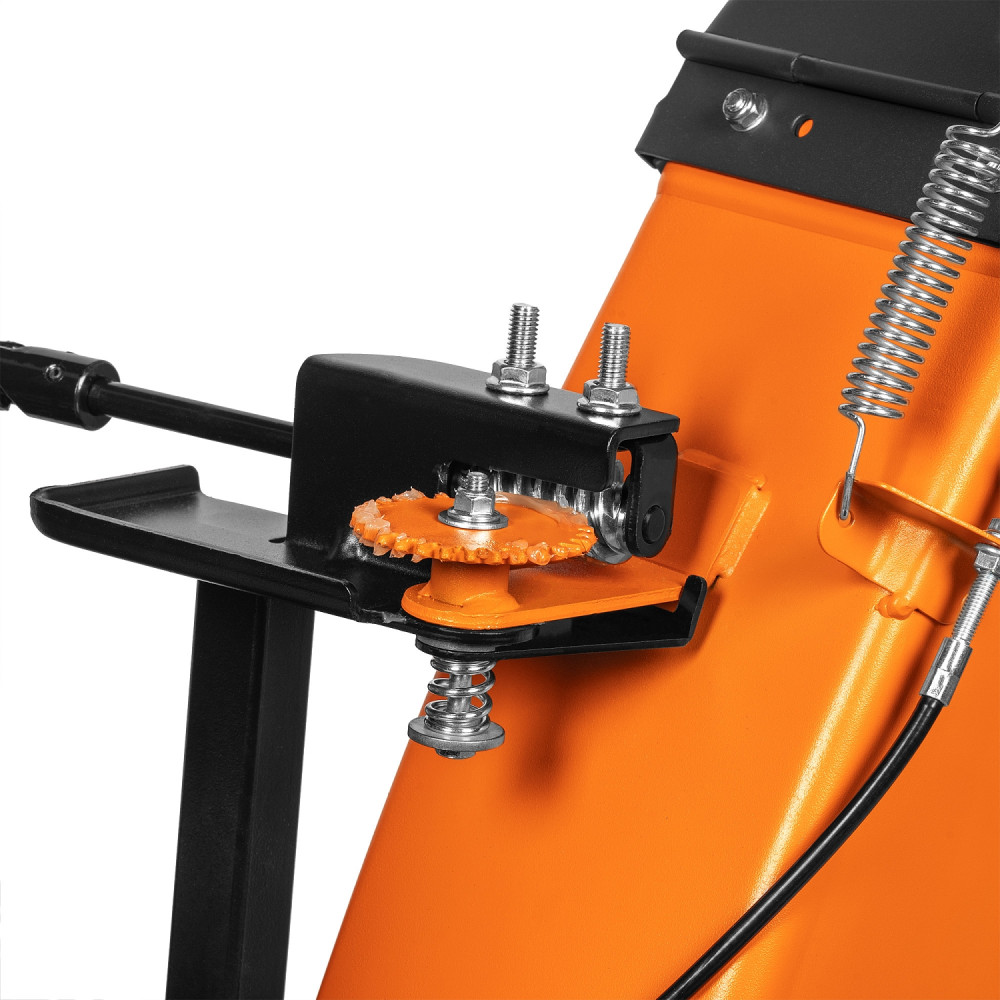 - Взаимная блокировка рукояток. Нажатие 2-х рукояток управления приводит к их взаимной блокировке. Это позволяет управлять снегоуборщиком одной рукой, и одновременно изменять направление и дальность выброса снега без остановки работы.