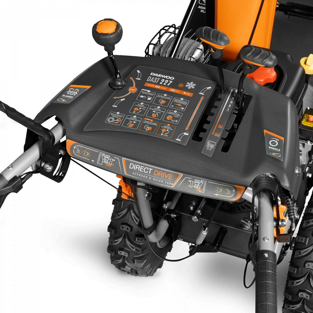 - Панель управления. Панель управления с системой изменения скорости передвижения, направления и дальности выброса снега обеспечивает комфортное управление и работу со снегоуборщиком.
