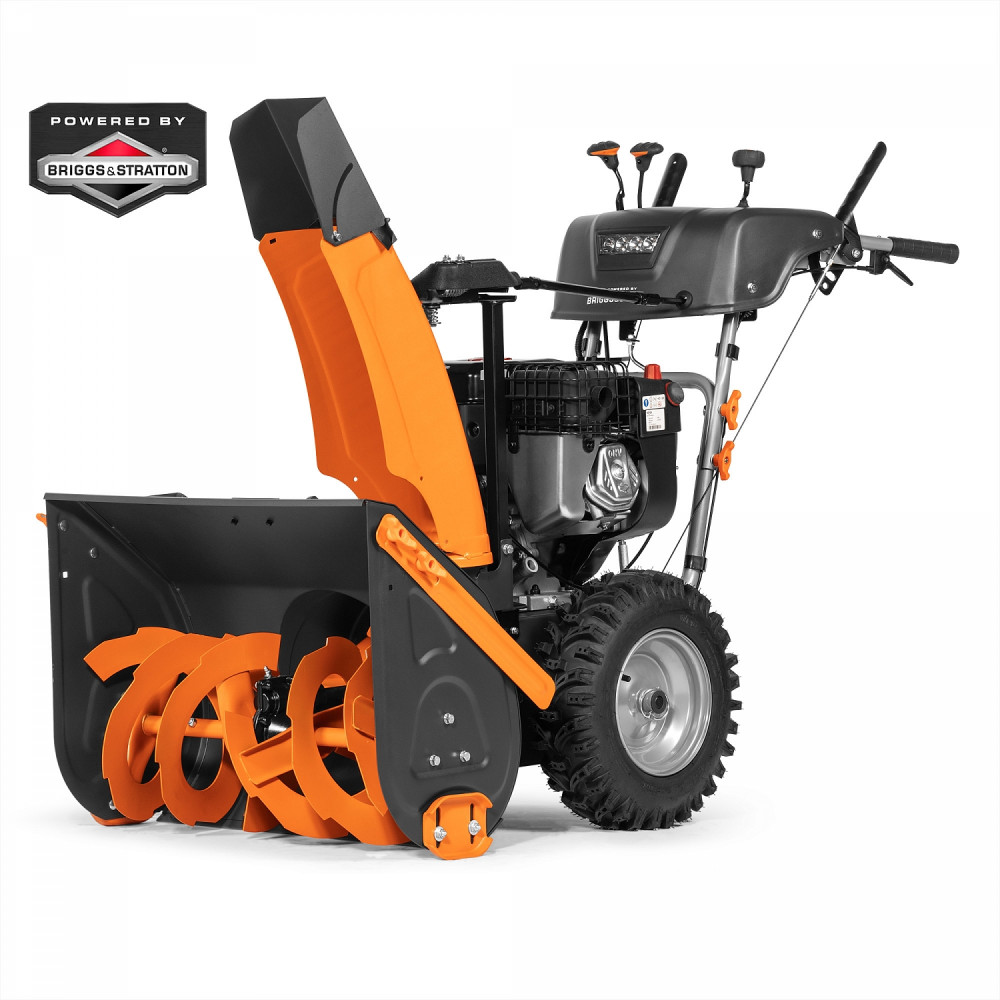 - LED фара. Яркая LED фара обеспечивает освещение рабочей зоны, помогая работать в темное время суток, и делает работающий снегоуборщик заметным для окружающий, ограждая от попадания под выбрасываемый снег.