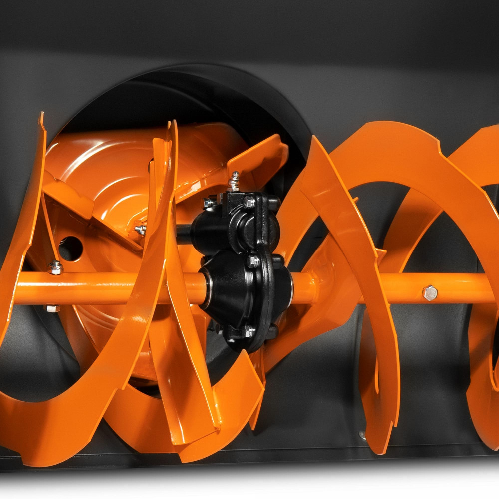 - Усиленный редуктор. Усиленный редуктор в паре со стальными опорами шнека с подшипниками передает до 95% крутящего момента на рабочие узлы сборки и выброса снега. Выходной вал редуктора крепится на подшипниках большого диаметра, что обеспечивает высокую устойчивость механизмов к вибрации и ударам.