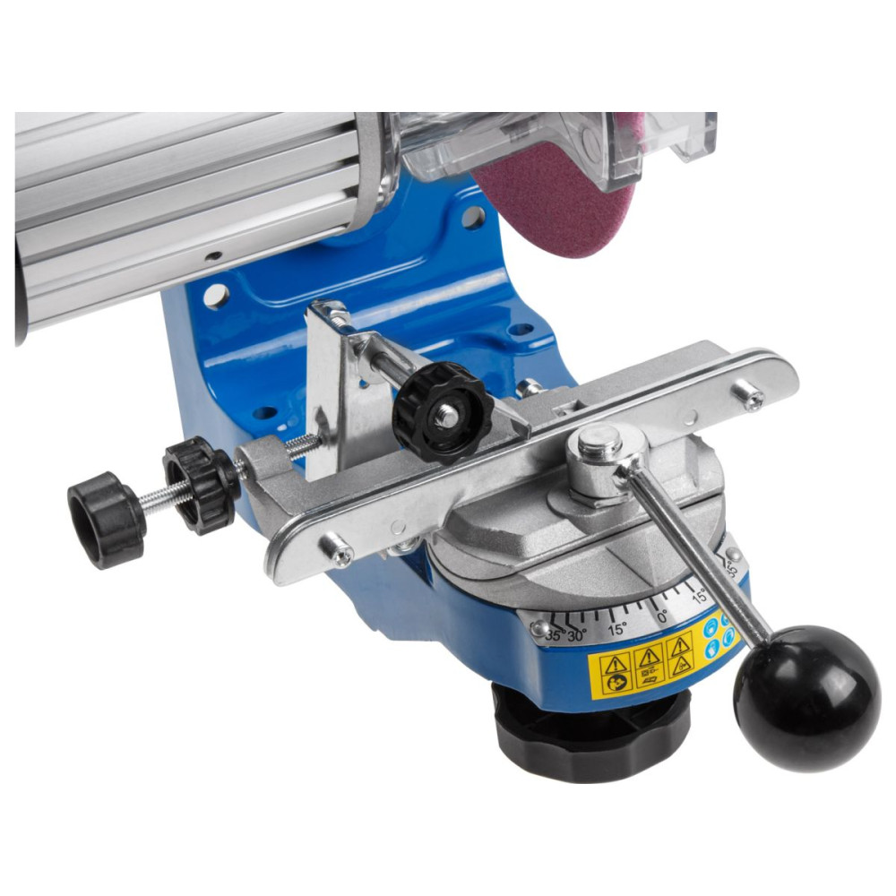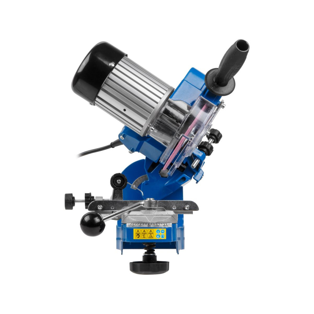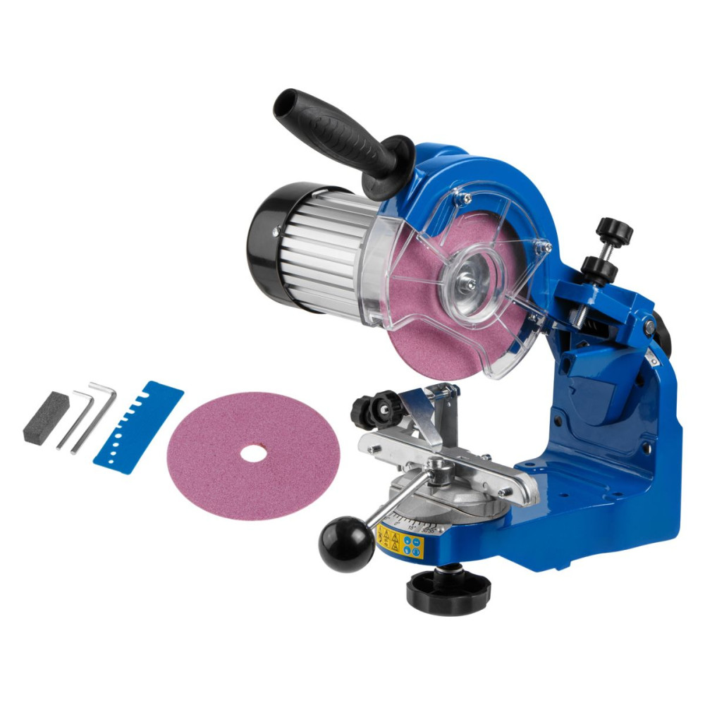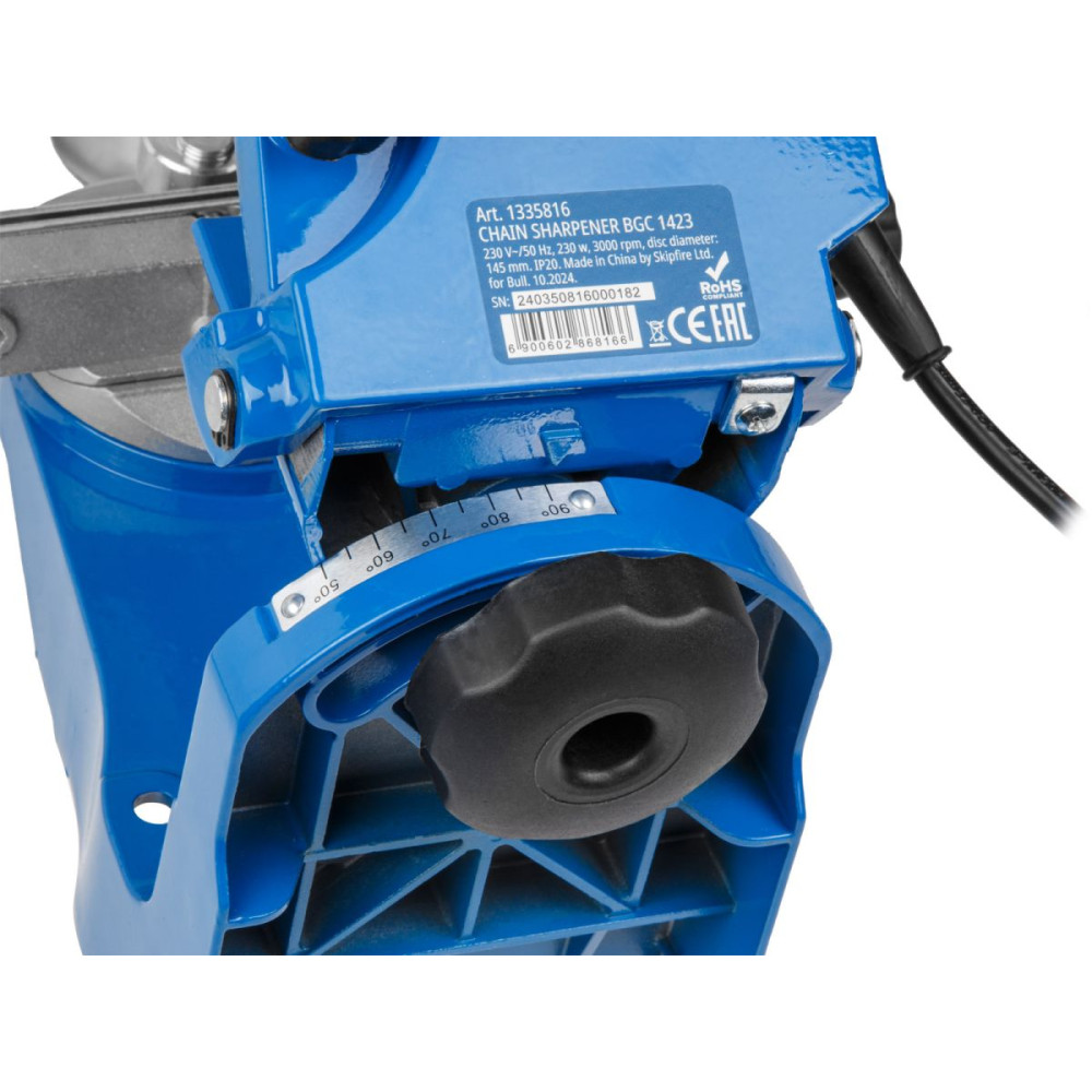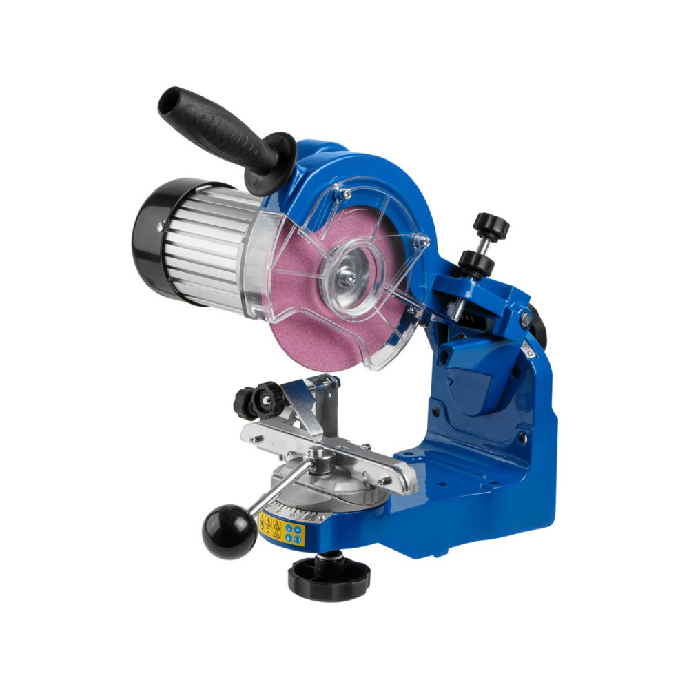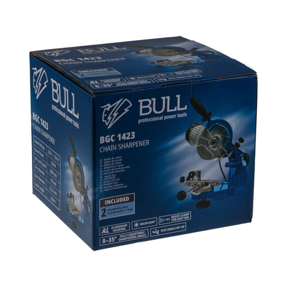 Станок для заточки пильных цепей BULL имеет надежный двигатель и ряд преимуществ для работы с различными видами цепей: прочное металлическое основание, большое количество регулировок, подсветка рабочей зоны, прозрачный защитный кожух, два заточных диска разной толщины в комплекте, возможность настенного крепления.