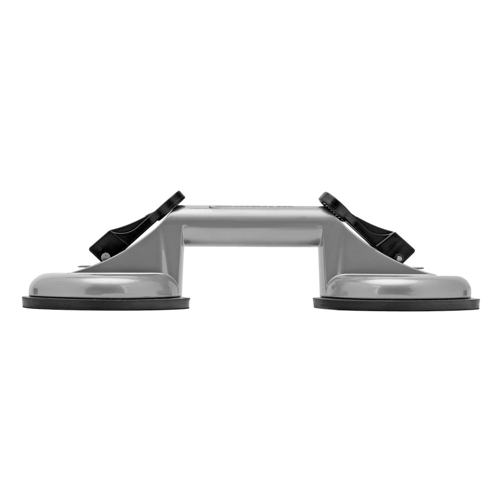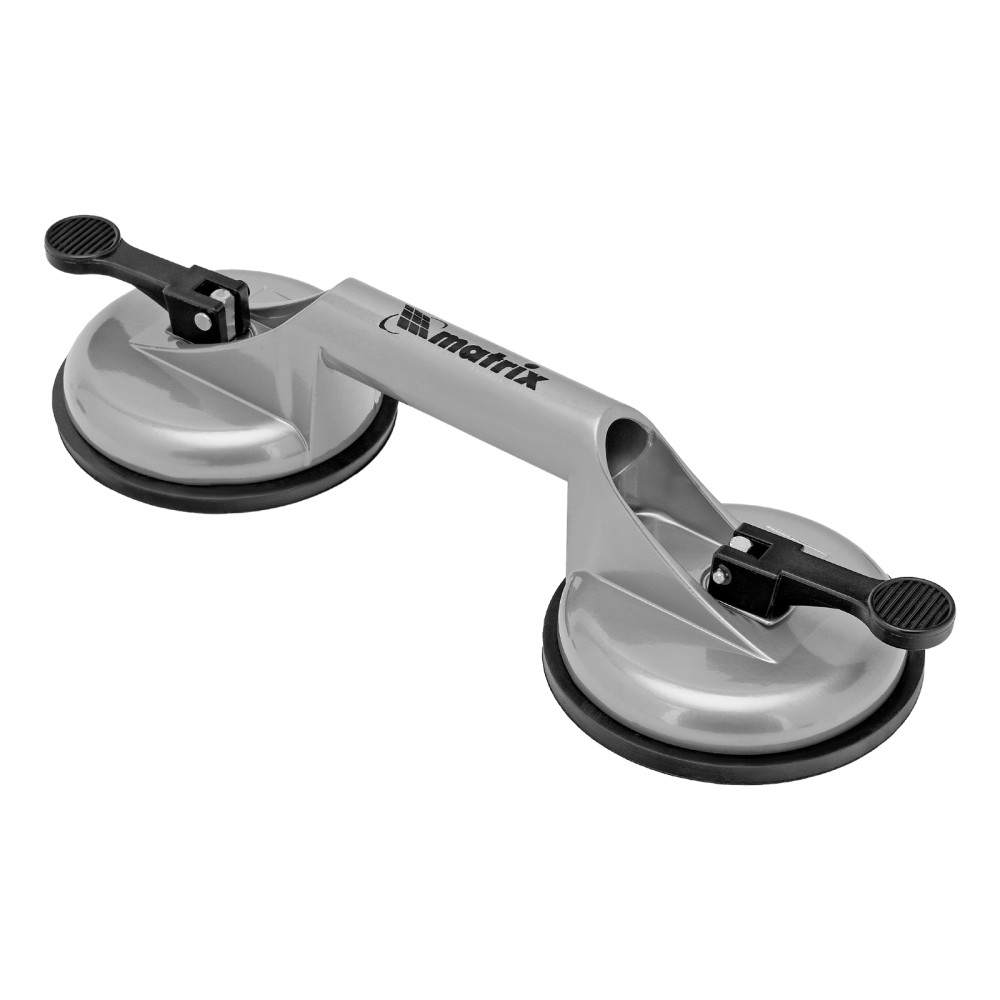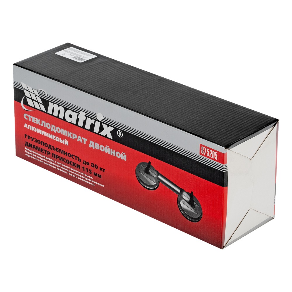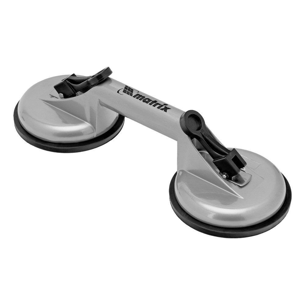 Алюминиевый двойной стеклодомкрат Matrix 875205 позволяет поднимать, переносить и устанавливать стекла, зеркала, плитку, листовой металл и другие гладкие материалы. Имеет две вакуумные присоски, которые бережно и надежно фиксируются на поверхности при помощи зажимов. Стеклодомкрат позволяет длительное время удерживать груз весом до 80 кг. Будет полезен во время строительства, ремонта, а также пригодится в быту.ПреимуществаПрочность — корпус изготовлен из алюминиевого сплава.Долговечность — стеклодомкрат устойчив к коррозии.Эргономичность — удобная рукоятка помогает удерживать груз.