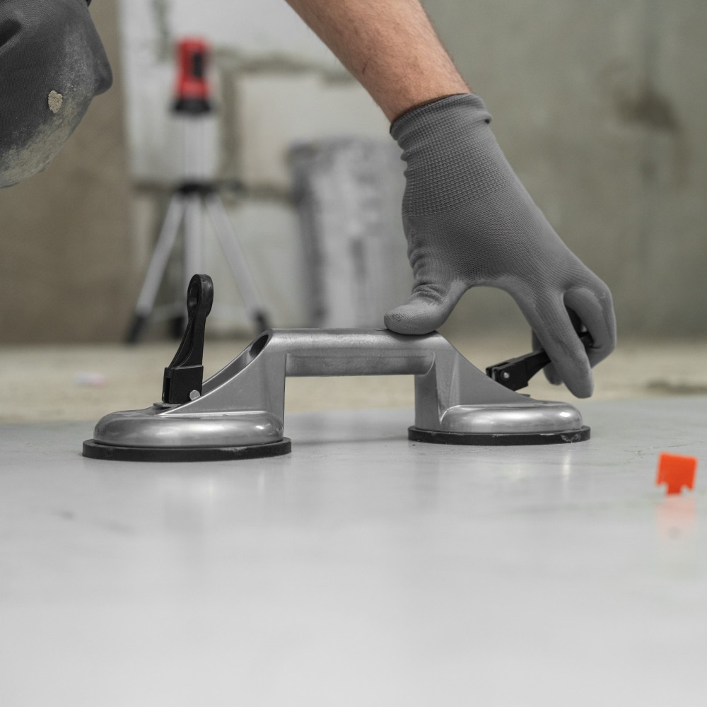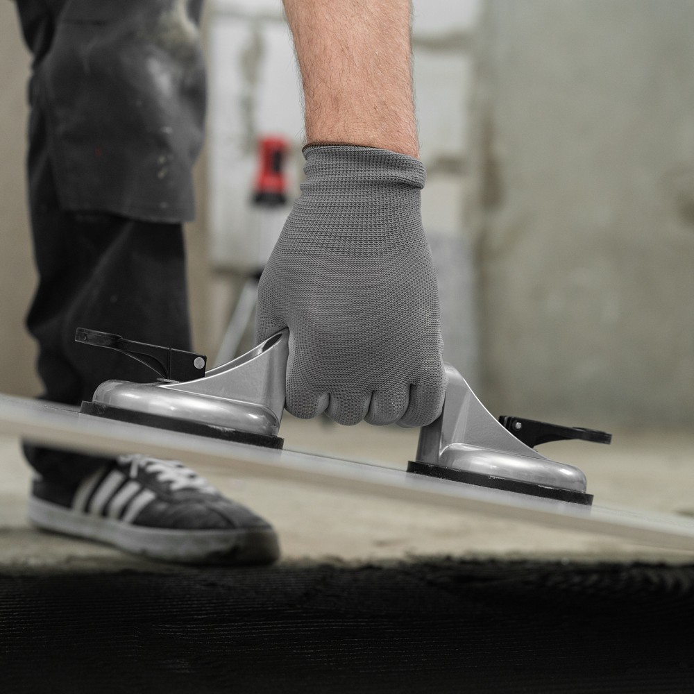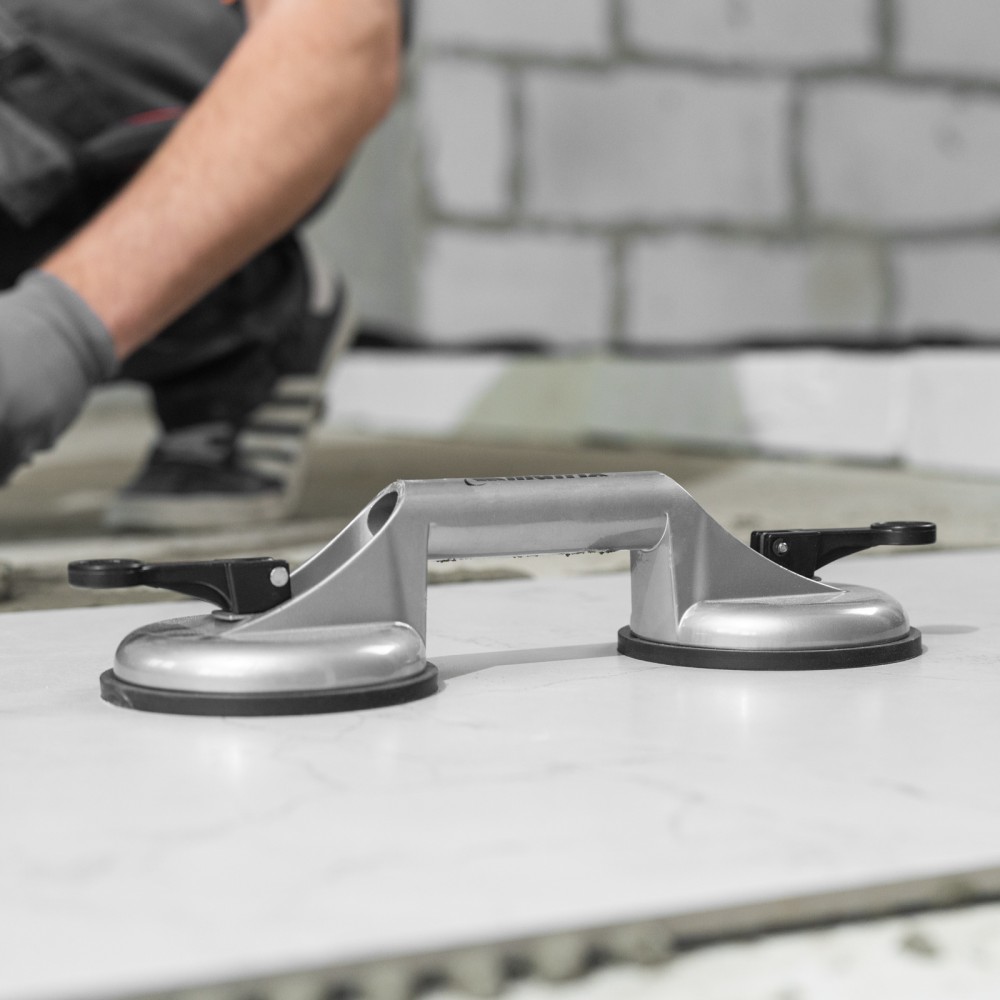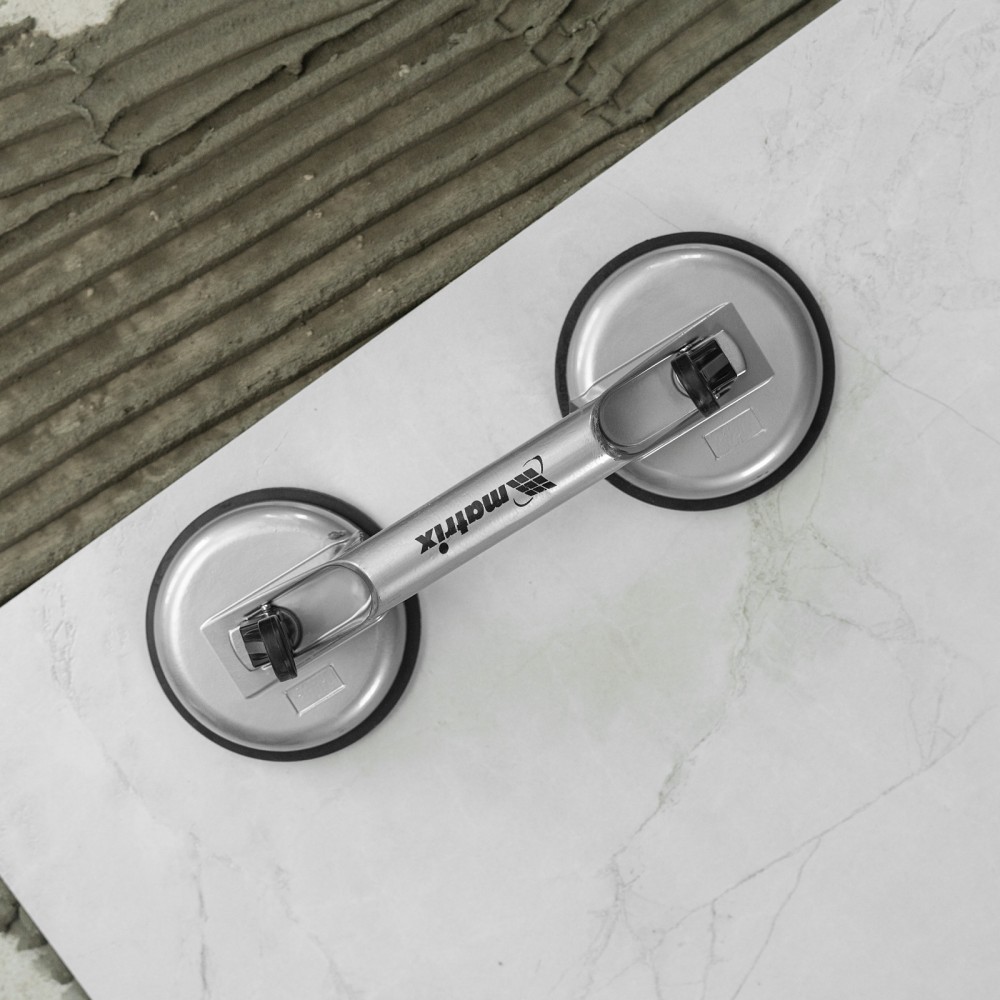 Алюминиевый двойной стеклодомкрат Matrix 875205 позволяет поднимать, переносить и устанавливать стекла, зеркала, плитку, листовой металл и другие гладкие материалы. Имеет две вакуумные присоски, которые бережно и надежно фиксируются на поверхности при помощи зажимов. Стеклодомкрат позволяет длительное время удерживать груз весом до 80 кг. Будет полезен во время строительства, ремонта, а также пригодится в быту.ПреимуществаПрочность — корпус изготовлен из алюминиевого сплава.Долговечность — стеклодомкрат устойчив к коррозии.Эргономичность — удобная рукоятка помогает удерживать груз.