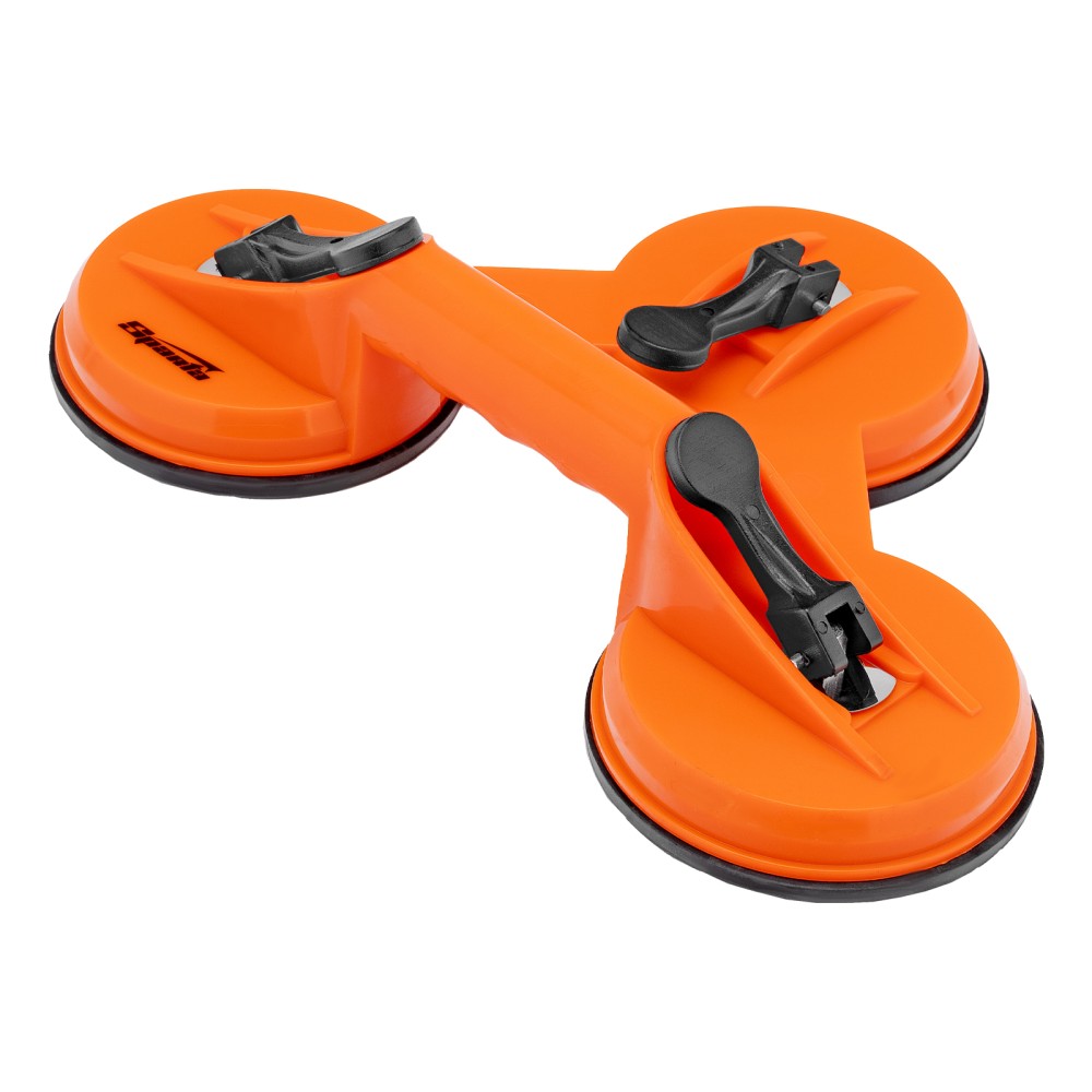 Тройной пластиковый стеклодомкрат Sparta 875156 — устройство для удержания, переноски и установки зеркал, стекол, столешниц, кафельной плитки и других гладких материалов. Три вакуумные присоски имеют зажимы, которые бережно, но крепко фиксируют их на поверхности. Стеклодомкрат будет полезен во время ремонта, а также пригодится в быту.ПреимуществаПрочность и надежность — корпус из противоударного пластика и присоски для стекол рассчитаны на длительное использование.Эффективное применение — 3 присоски для переноски стекла позволяют длительное время удерживать груз весом до 120 кг.Комфорт в работе — эргономичную рукоятку удобно держать в руках во время перемещения предметов.