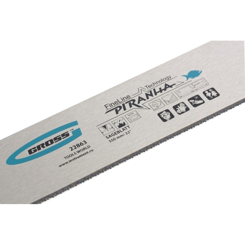 Пильное полотно Gross «PIRANHA» 22863 длиной 550 мм, с каленым зубом с 2D-заточкой, 18 TPI — режущий элемент для прецизионного стусла, применяемый для распила под углом заготовок из дерева, мягкого металла и пластика. Мелкие зубья с шагом 18 TPI позволяют получить точный и чистый рез. Полотно используется для пиления плинтусов, реек, дверных наличников и других деталей.