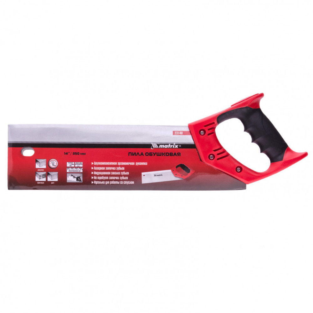 Обушковая пила по дереву для стусла Matrix 23148 с полотном длиной 350 мм, с двухкомпонентной рукояткой, используется для продольно-поперечного пиления древесины, фанеры, ДСП. Ребро жесткости не дает полотну изгибаться, поэтому ножовкой удобно производить распил под углом — например, при работе со стуслом. Зубья с двухгранной лазерной заточкой позволяют осуществлять двусторонний рез без нажима на поверхность материала. Шаг зубьев составляет 2 мм, что обеспечивает чистый и ровный рез. Пила пригодится при проведении столярных работ дома или в мастерской.