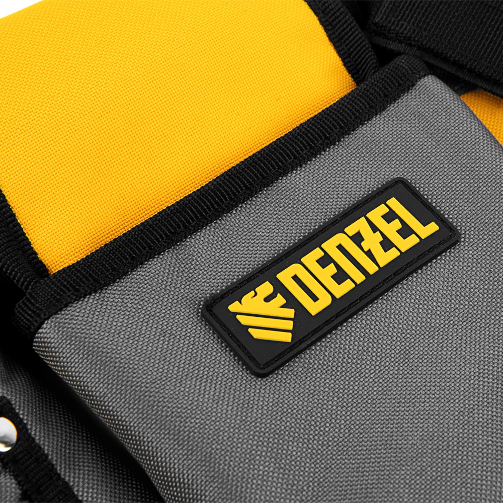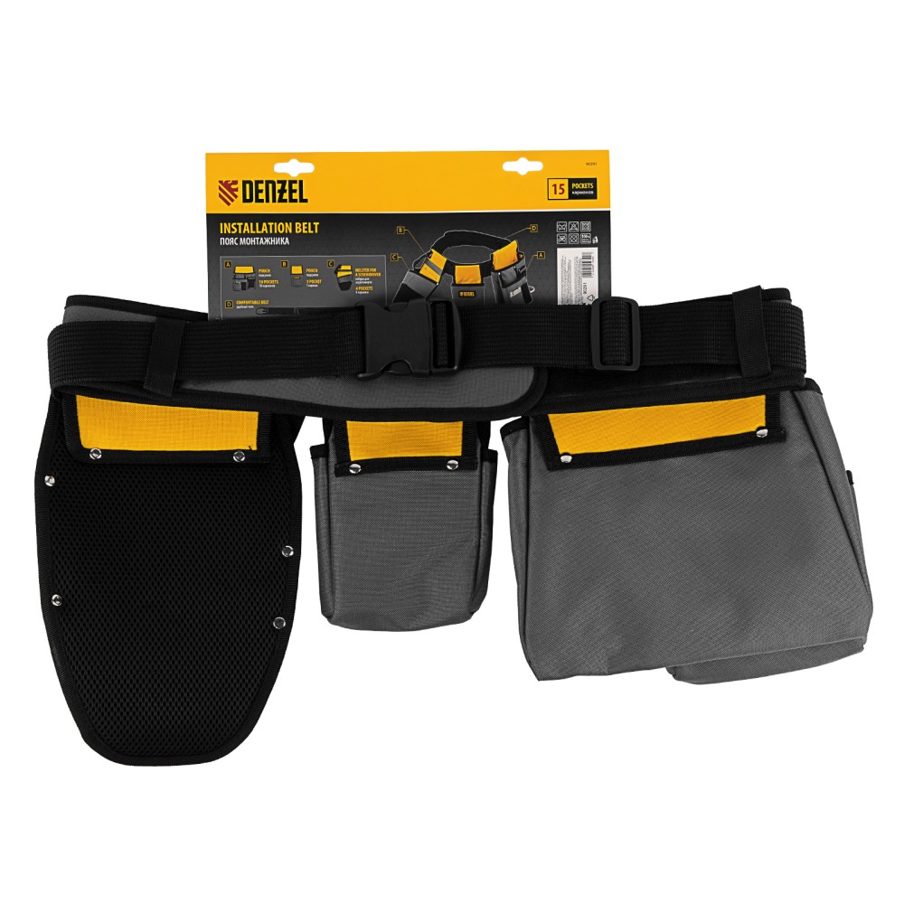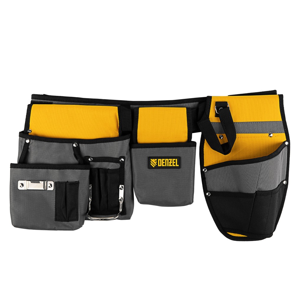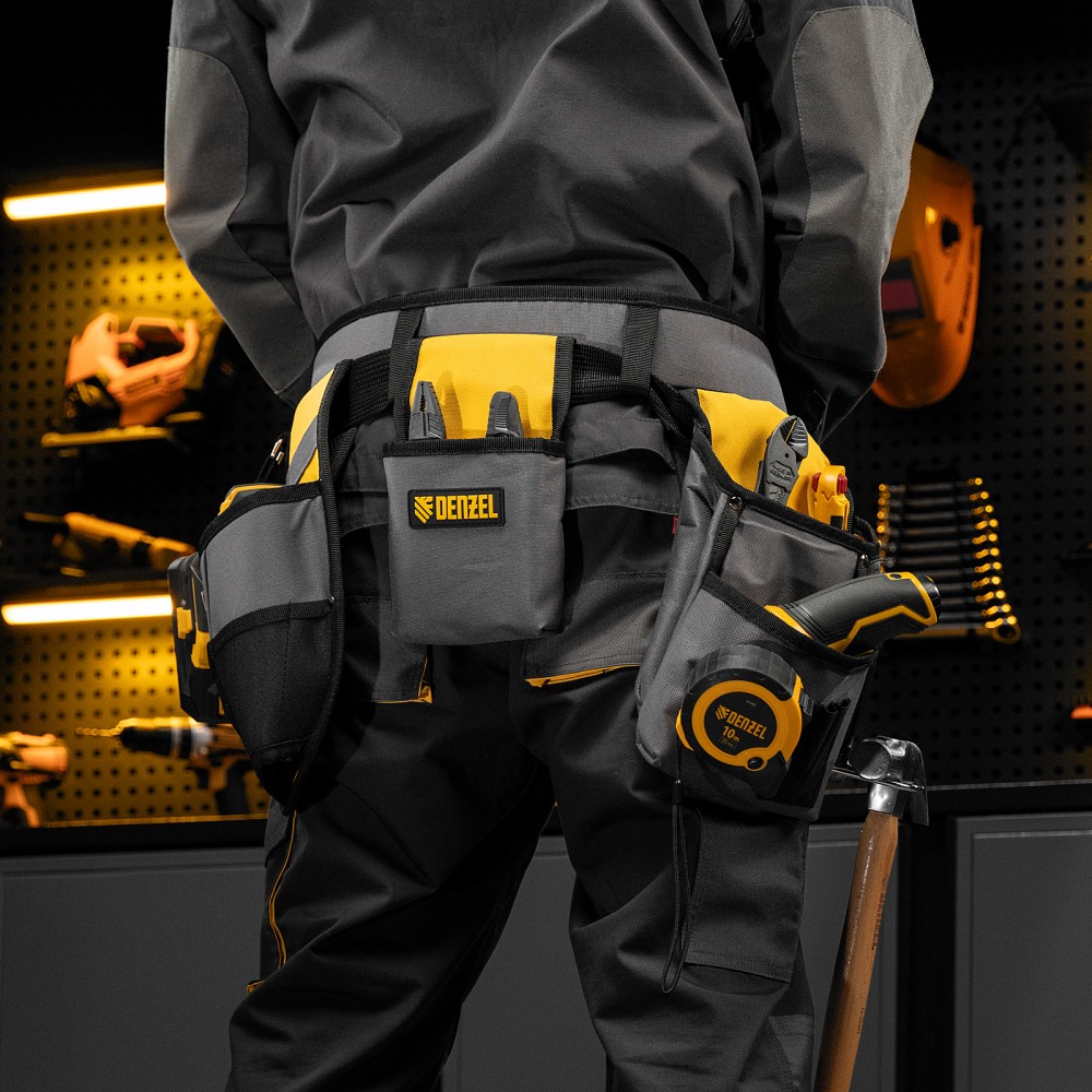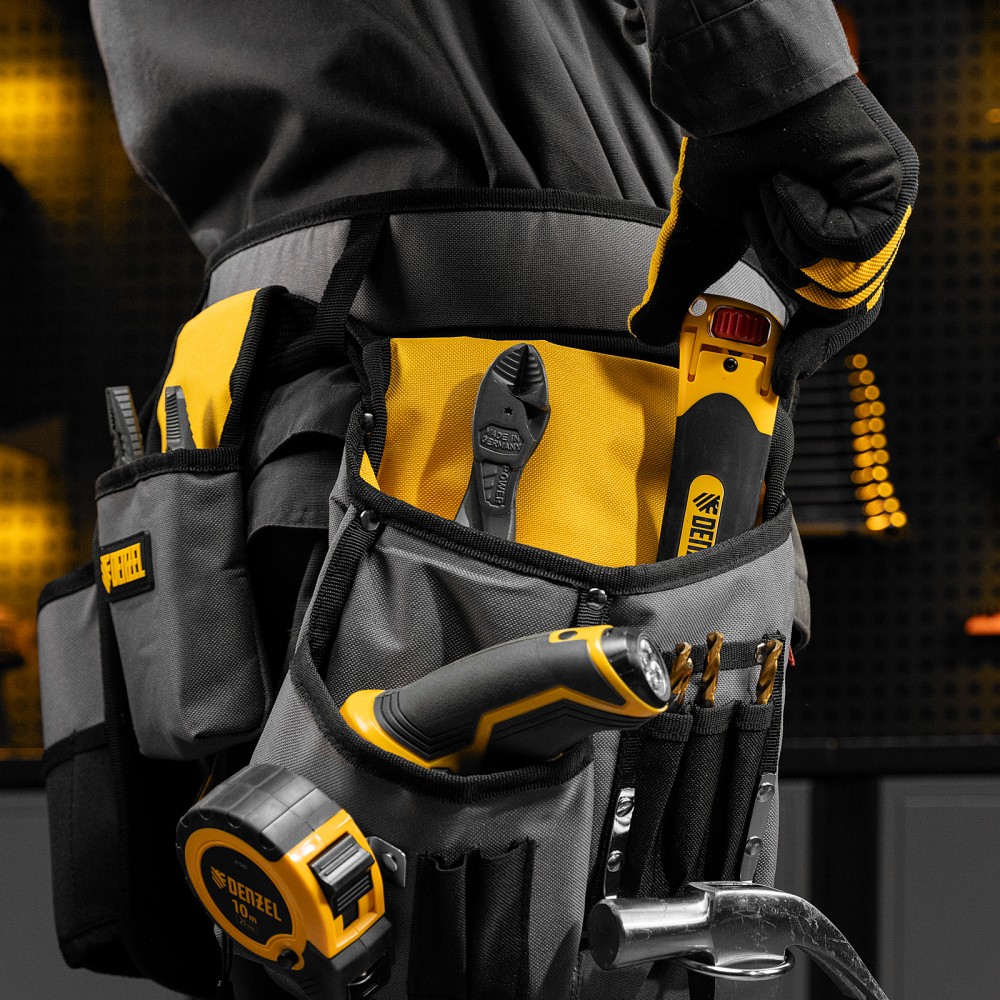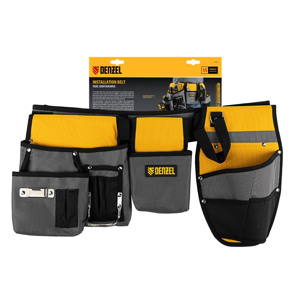 Пояс монтажника Denzel 90291 с поясными сумками и кобурой для шуруповерта позволяет иметь все необходимые инструменты под рукой во время высотных монтажных работ или решения других задач. В 14 карманах и дополнительном подсумке можно разместить инструменты, крепеж и расходники. Для шуруповерта предусмотрена специальная кобура со страховочной петлей.ПреимуществаПрочность и износостойкость — сумки из плотного полиэстера 600 D с карманами, усиленными стальными заклепками, не рвутся и не протираются.Надежность — ремень длиной 1230 мм имеет крепление «velcro» (липучка) и застежку «фастекс».Дополнительные возможности — на поясе предусмотрен держатель для молотка на стальных заклепках и крепление для рулетки.