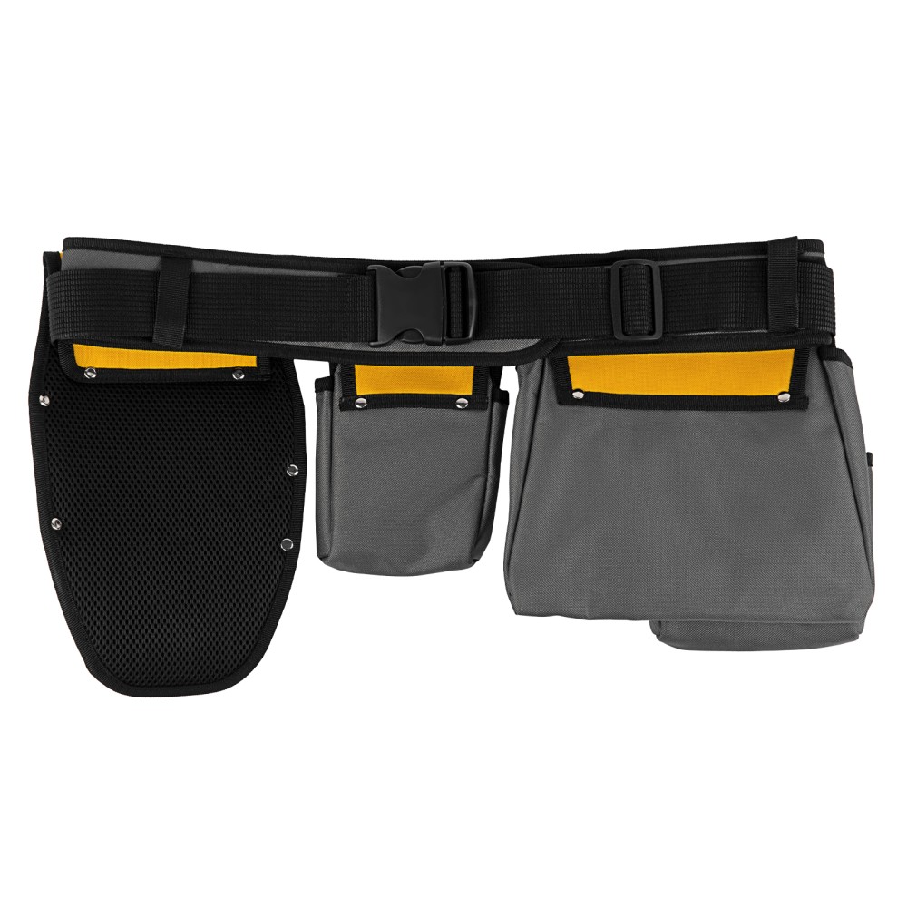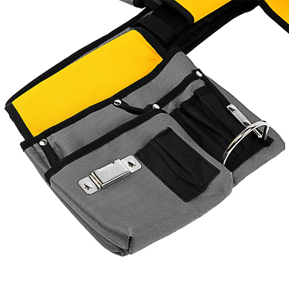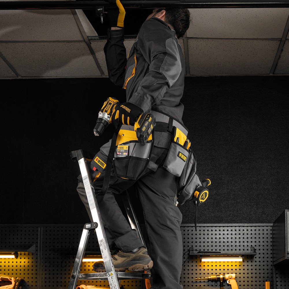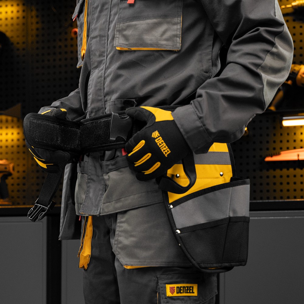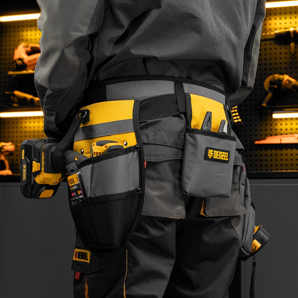 Пояс монтажника Denzel 90291 с поясными сумками и кобурой для шуруповерта позволяет иметь все необходимые инструменты под рукой во время высотных монтажных работ или решения других задач. В 14 карманах и дополнительном подсумке можно разместить инструменты, крепеж и расходники. Для шуруповерта предусмотрена специальная кобура со страховочной петлей.ПреимуществаПрочность и износостойкость — сумки из плотного полиэстера 600 D с карманами, усиленными стальными заклепками, не рвутся и не протираются.Надежность — ремень длиной 1230 мм имеет крепление «velcro» (липучка) и застежку «фастекс».Дополнительные возможности — на поясе предусмотрен держатель для молотка на стальных заклепках и крепление для рулетки.