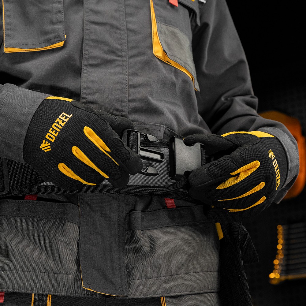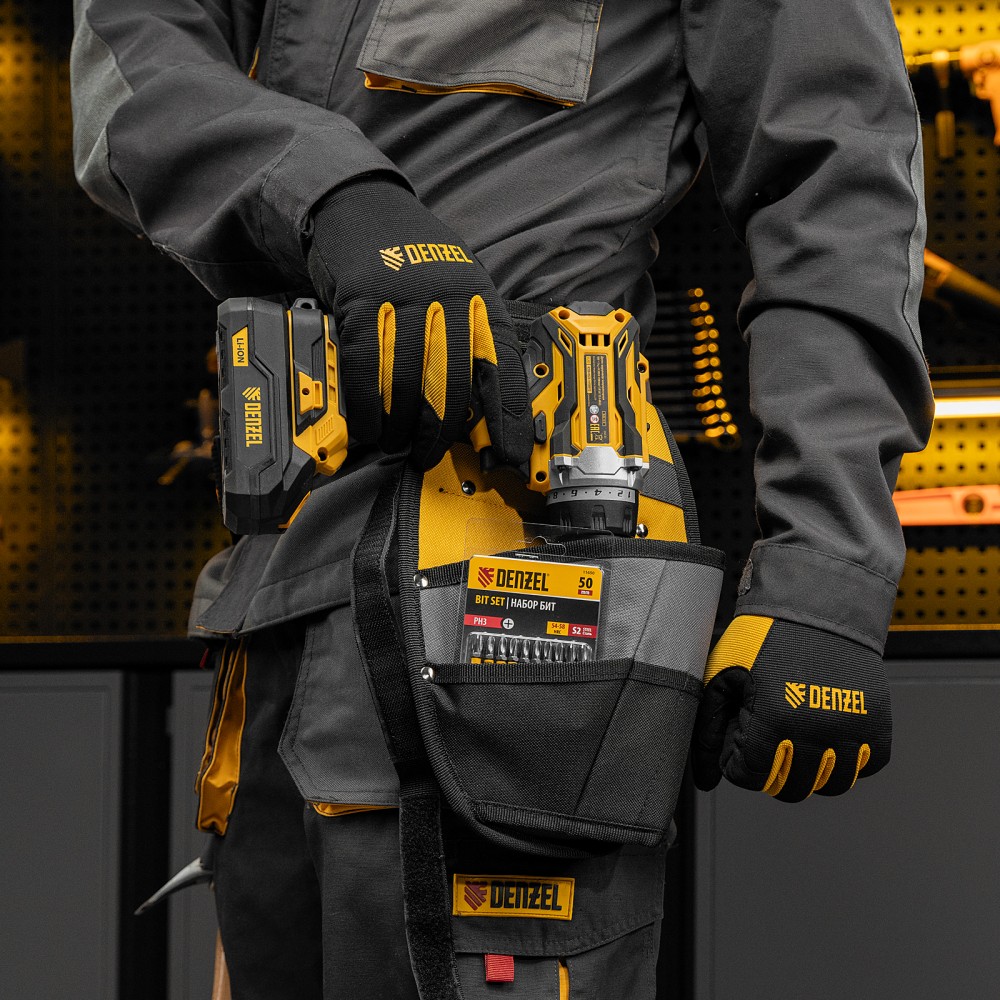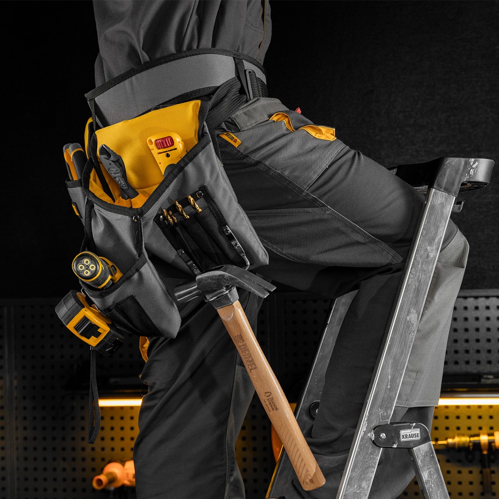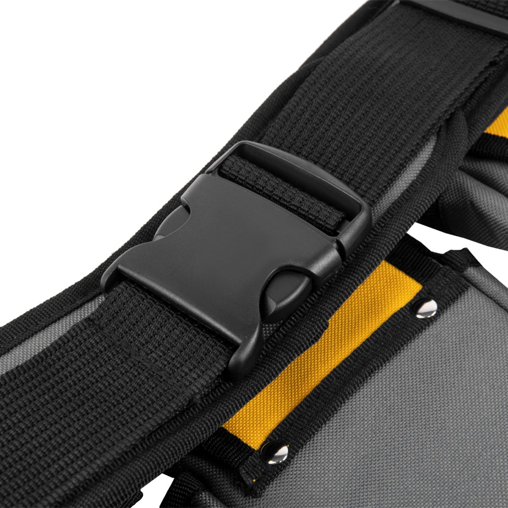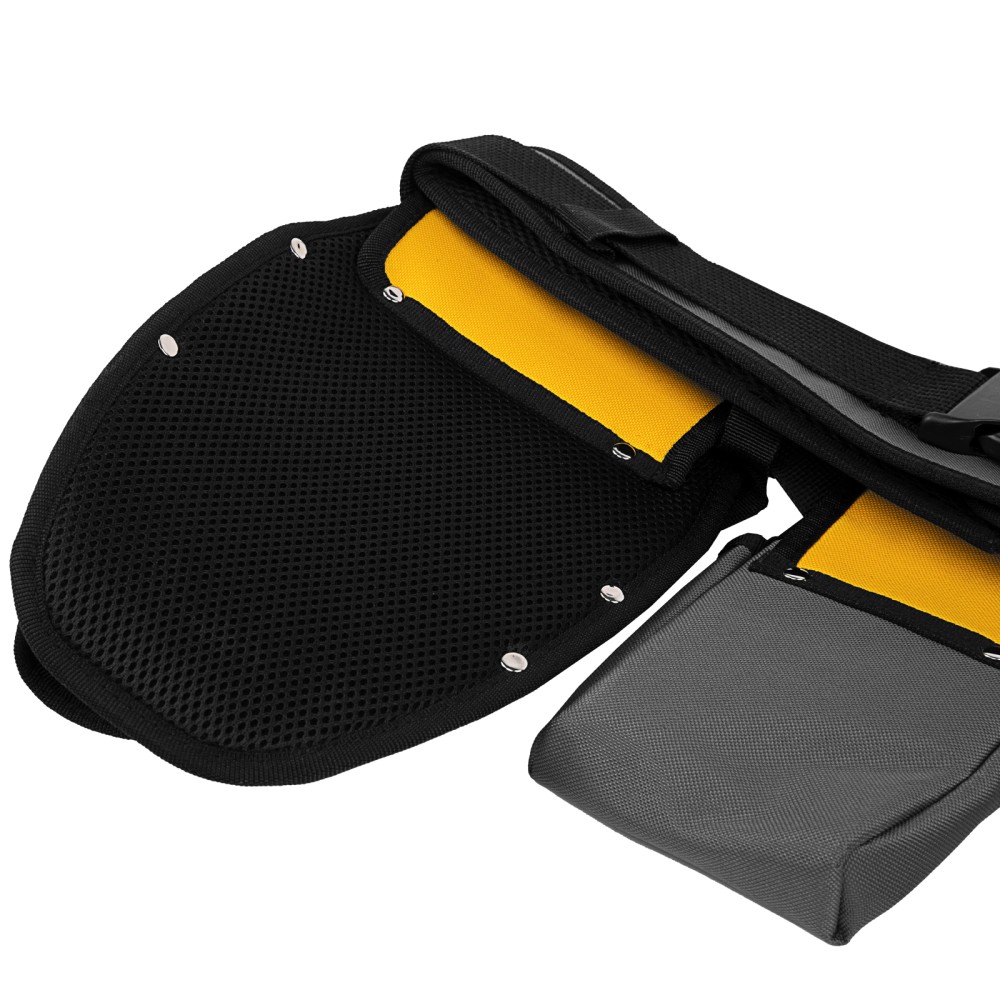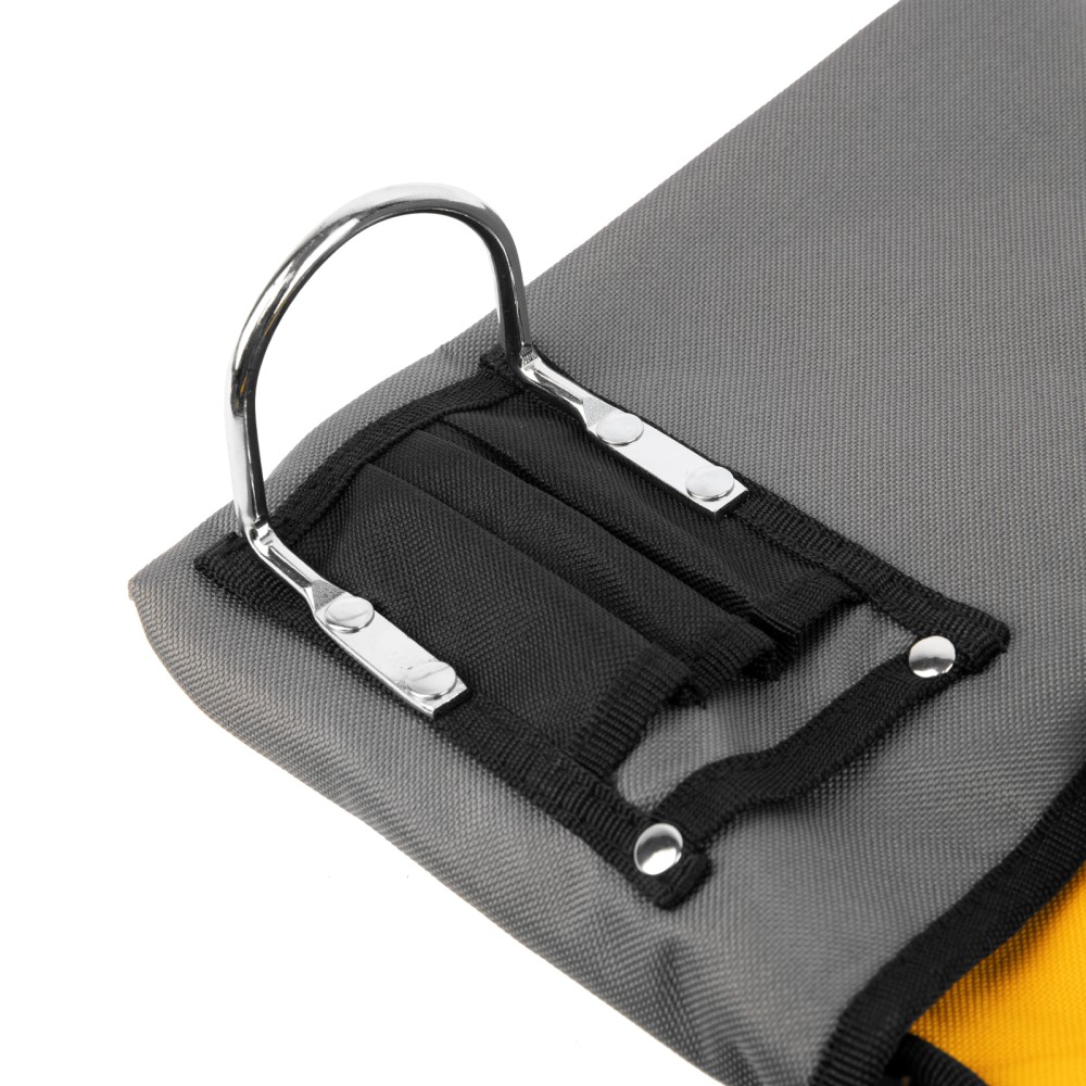 Пояс монтажника Denzel 90291 с поясными сумками и кобурой для шуруповерта позволяет иметь все необходимые инструменты под рукой во время высотных монтажных работ или решения других задач. В 14 карманах и дополнительном подсумке можно разместить инструменты, крепеж и расходники. Для шуруповерта предусмотрена специальная кобура со страховочной петлей.ПреимуществаПрочность и износостойкость — сумки из плотного полиэстера 600 D с карманами, усиленными стальными заклепками, не рвутся и не протираются.Надежность — ремень длиной 1230 мм имеет крепление «velcro» (липучка) и застежку «фастекс».Дополнительные возможности — на поясе предусмотрен держатель для молотка на стальных заклепках и крепление для рулетки.