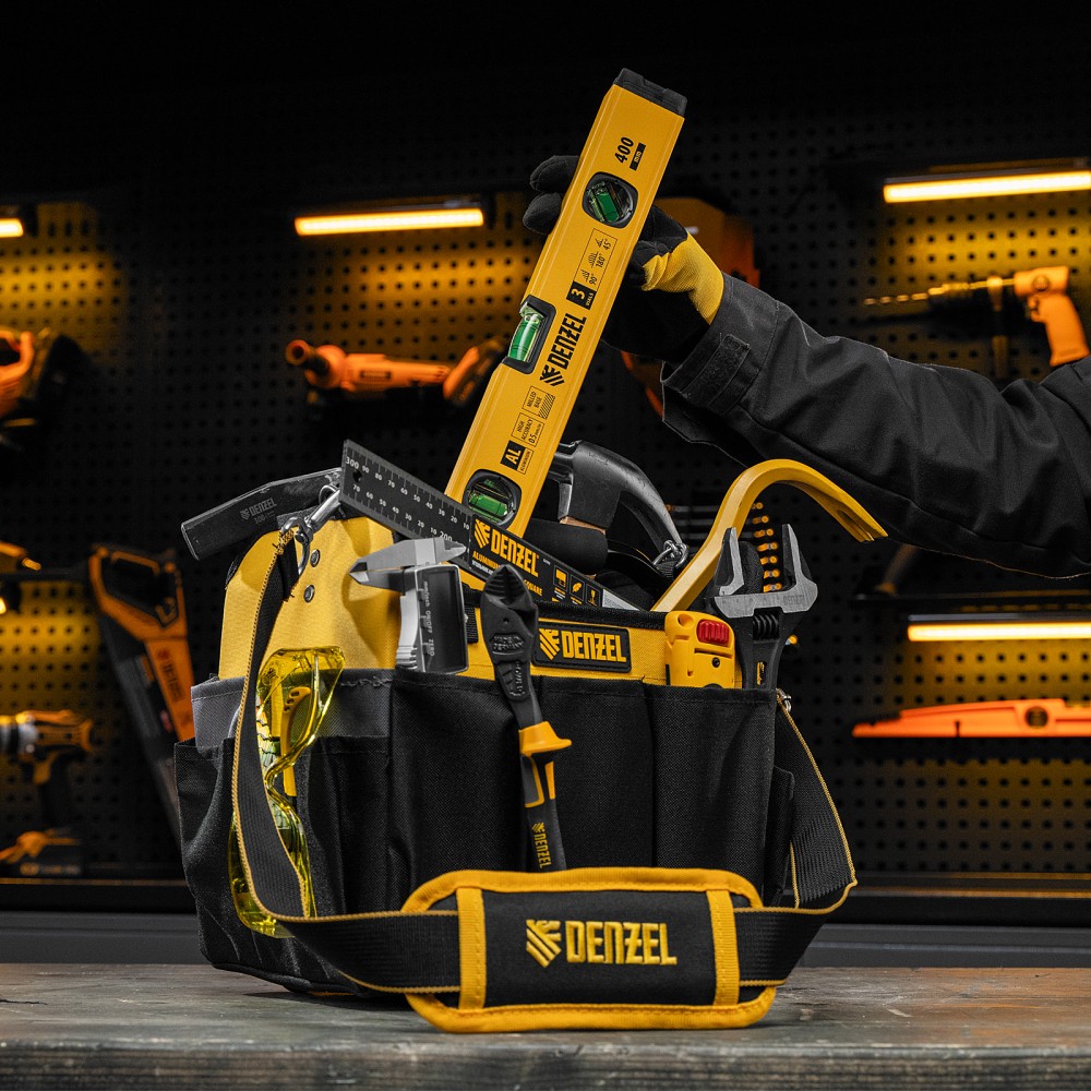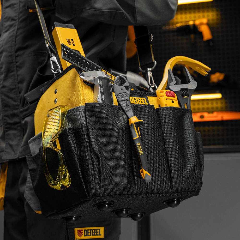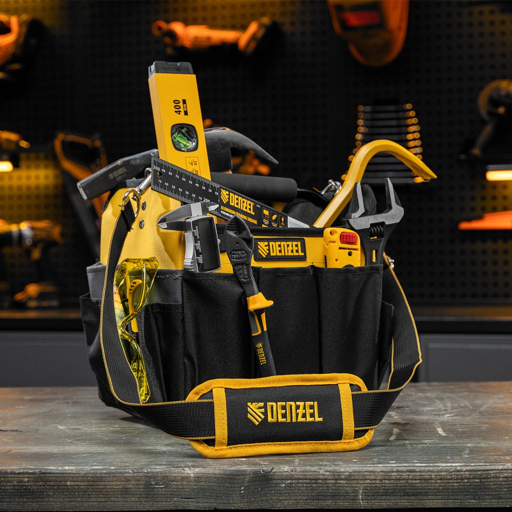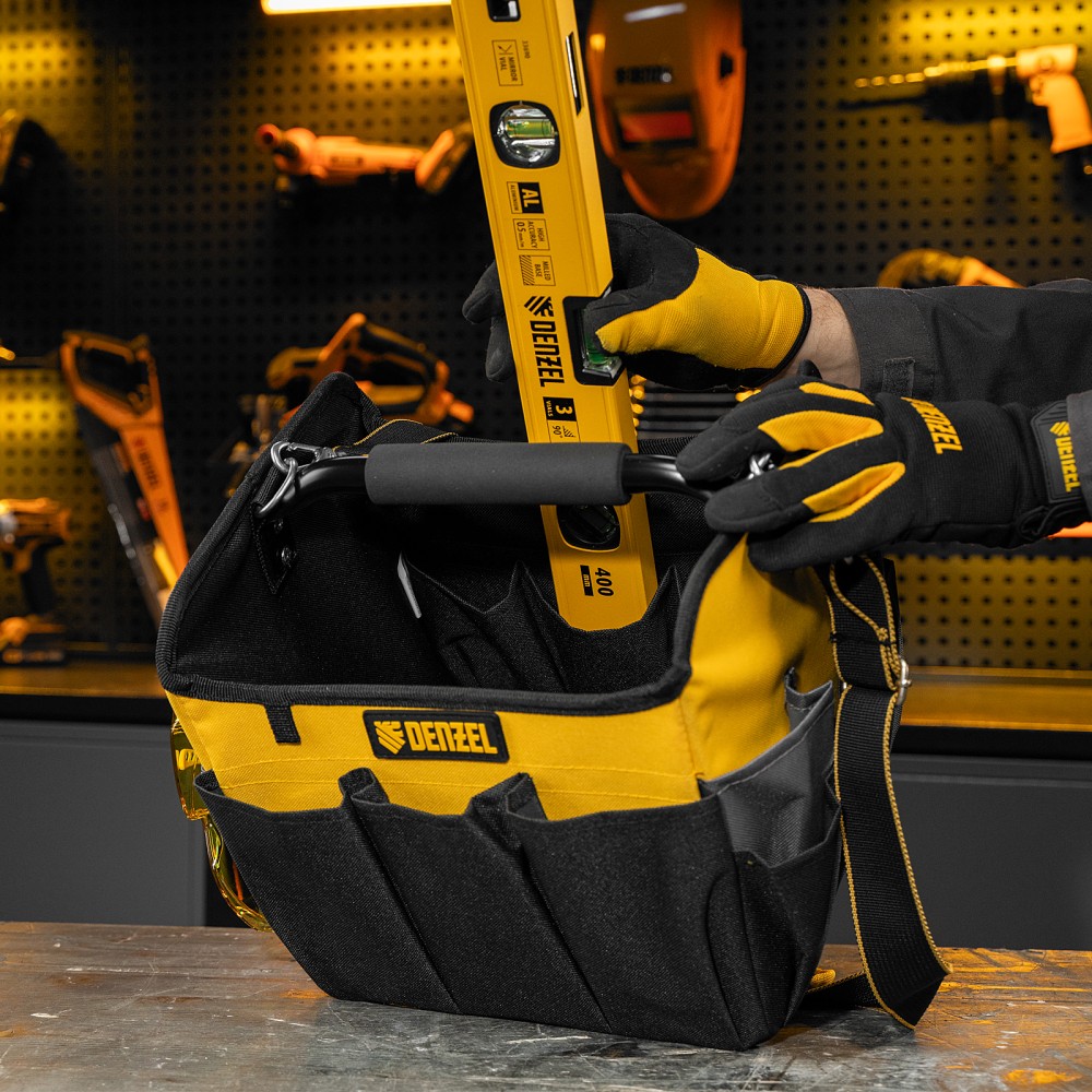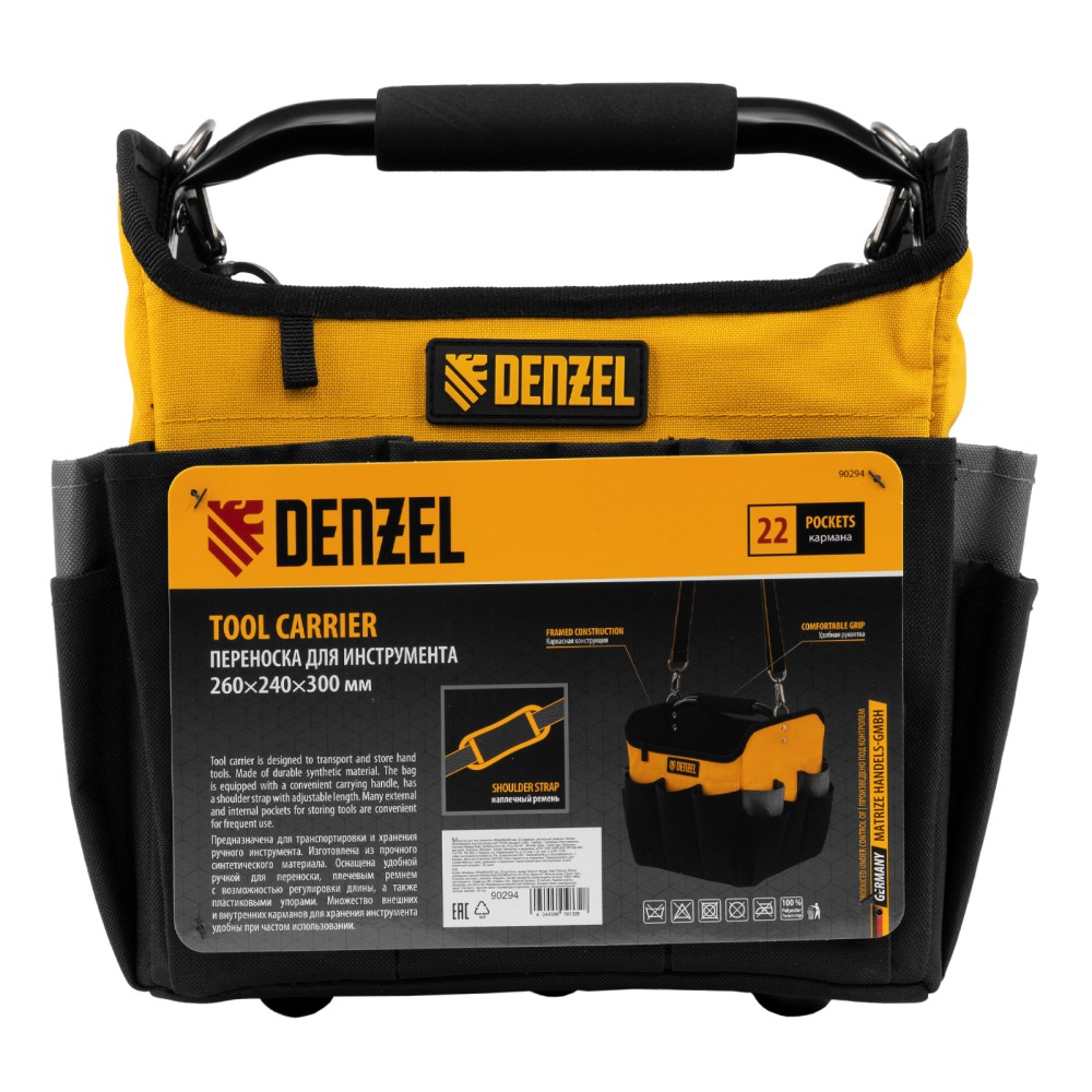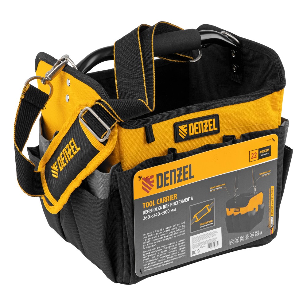 Переноска Denzel 90294 габаритами 260 х 240 х 300 мм, с наплечным ремнем, имеет вместительное основное отделение и 22 кармана. В ней можно разместить ручной и электроинструмент для хранения и транспортировки. Переноска пригодится в дороге, дома или в гараже.ПреимуществаИзносостойкость — переноска изготовлена из прочного полиэстера 600D, устойчивого к истиранию, на дне предусмотрено 5 пластиковых ножек.Грузоподъемность 20 кг — каркас усилен, рукоятка выполнена из прочного металла.Комфортная транспортировка — переноска комплектуется наплечным ремнем с усиленными карабинами (длина ремня регулируется в диапазоне 950-1350 мм), а на рукоятке имеется мягкая неопреновая накладка.