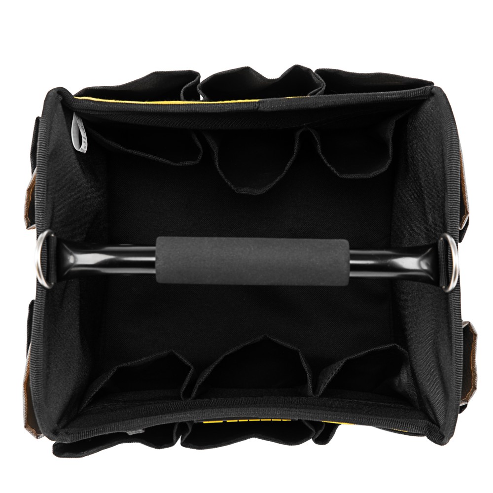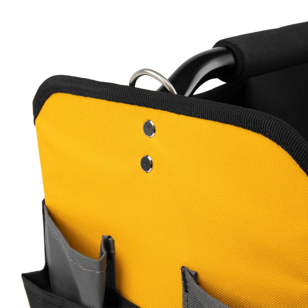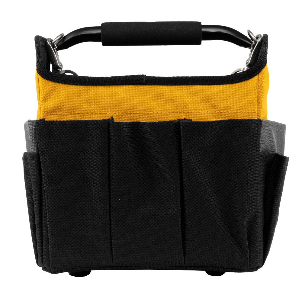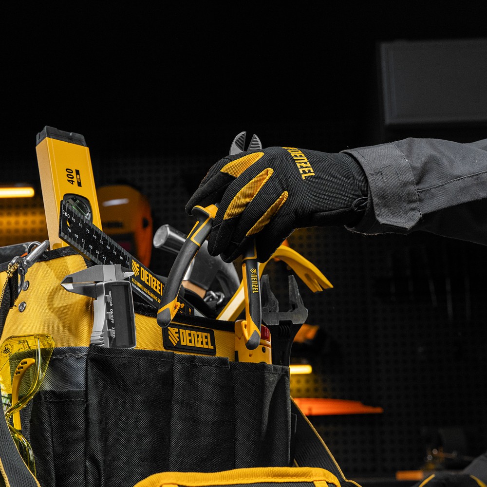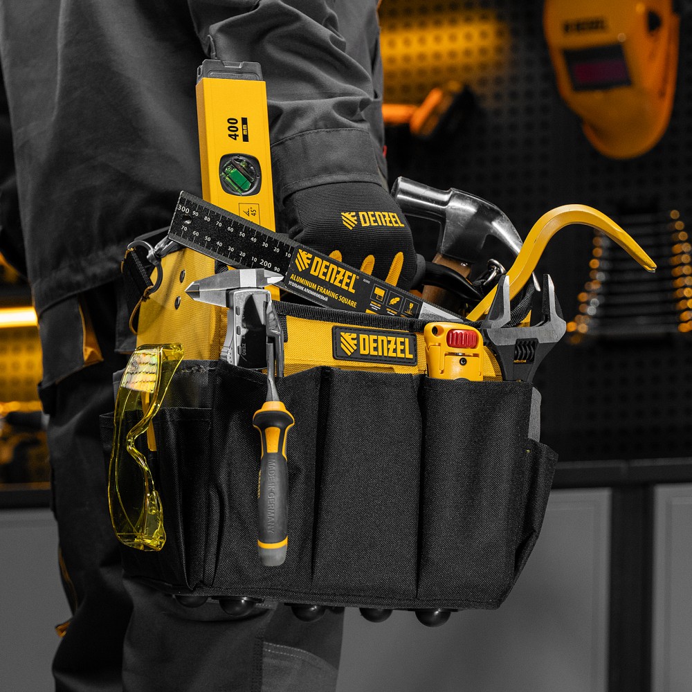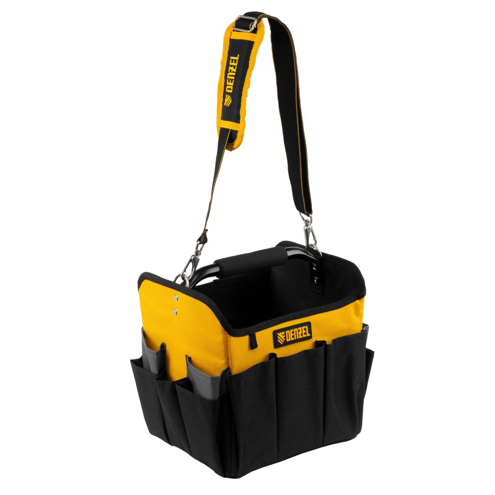 Переноска Denzel 90294 габаритами 260 х 240 х 300 мм, с наплечным ремнем, имеет вместительное основное отделение и 22 кармана. В ней можно разместить ручной и электроинструмент для хранения и транспортировки. Переноска пригодится в дороге, дома или в гараже.ПреимуществаИзносостойкость — переноска изготовлена из прочного полиэстера 600D, устойчивого к истиранию, на дне предусмотрено 5 пластиковых ножек.Грузоподъемность 20 кг — каркас усилен, рукоятка выполнена из прочного металла.Комфортная транспортировка — переноска комплектуется наплечным ремнем с усиленными карабинами (длина ремня регулируется в диапазоне 950-1350 мм), а на рукоятке имеется мягкая неопреновая накладка.