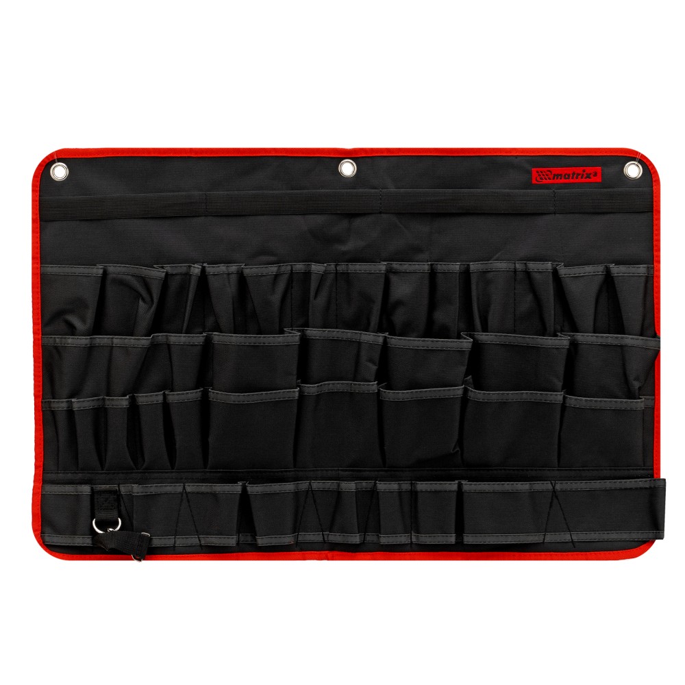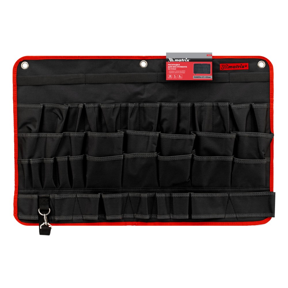 Настенная раскладка для инструмента Matrix 90245 размером 675 х 450 мм предназначена для хранения слесарных, монтажных и других принадлежностей. Благодаря ей все инструменты будут на своих местах и не потеряются. Разместить раскладку очень просто — она вешается на стену при помощи установленных в материале люверсов. Будет полезна дома, на даче и в гараже.ПреимуществаДолговечность и простой уход — раскладка из прочной ткани оксфорд устойчива к износу и легко чистится.Функциональность — в З8 карманах можно разместить инструменты разного размера и формы.Дополнительные возможности — резинка в верхней части удобна для фиксации длинных предметов.