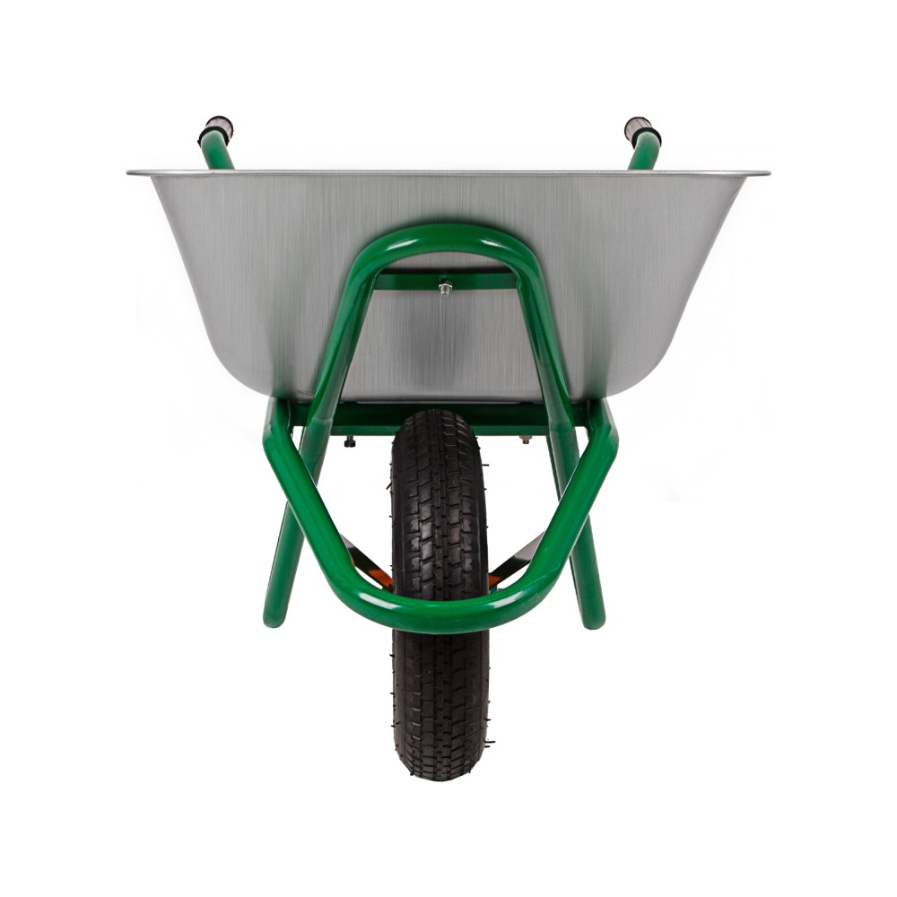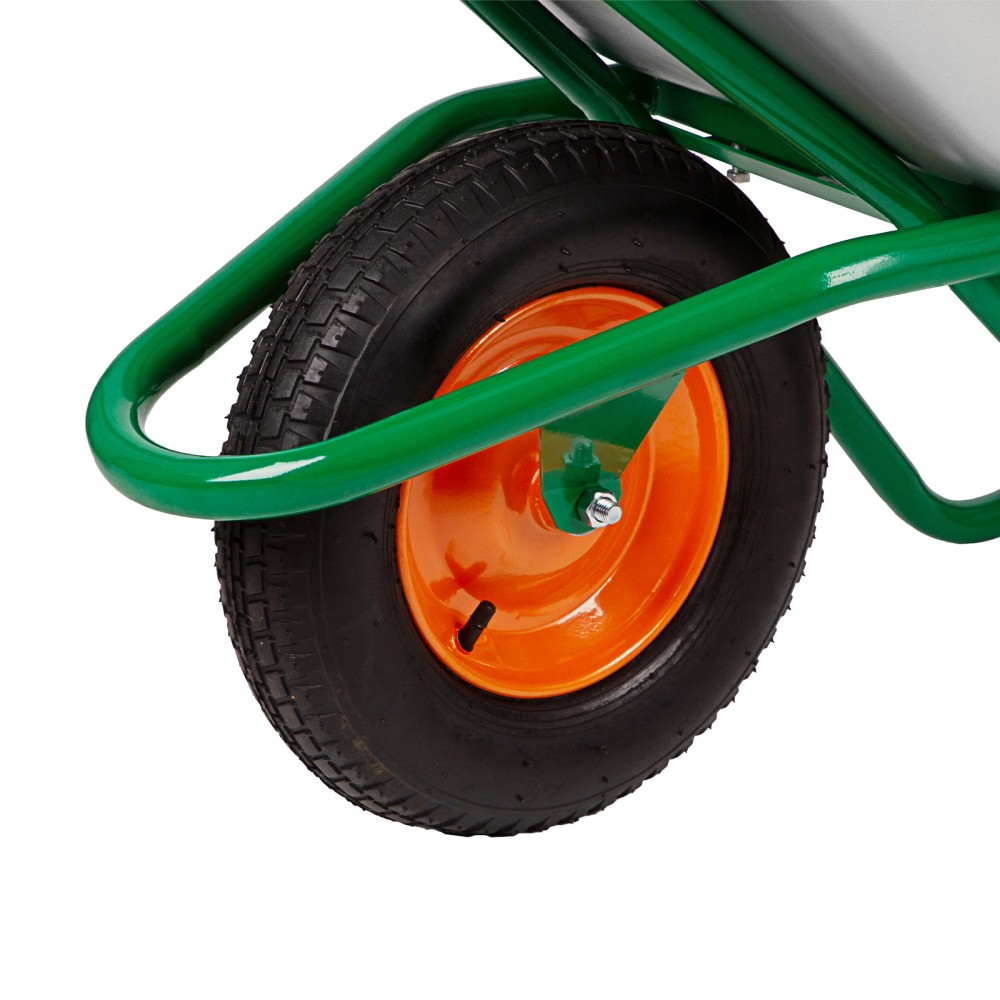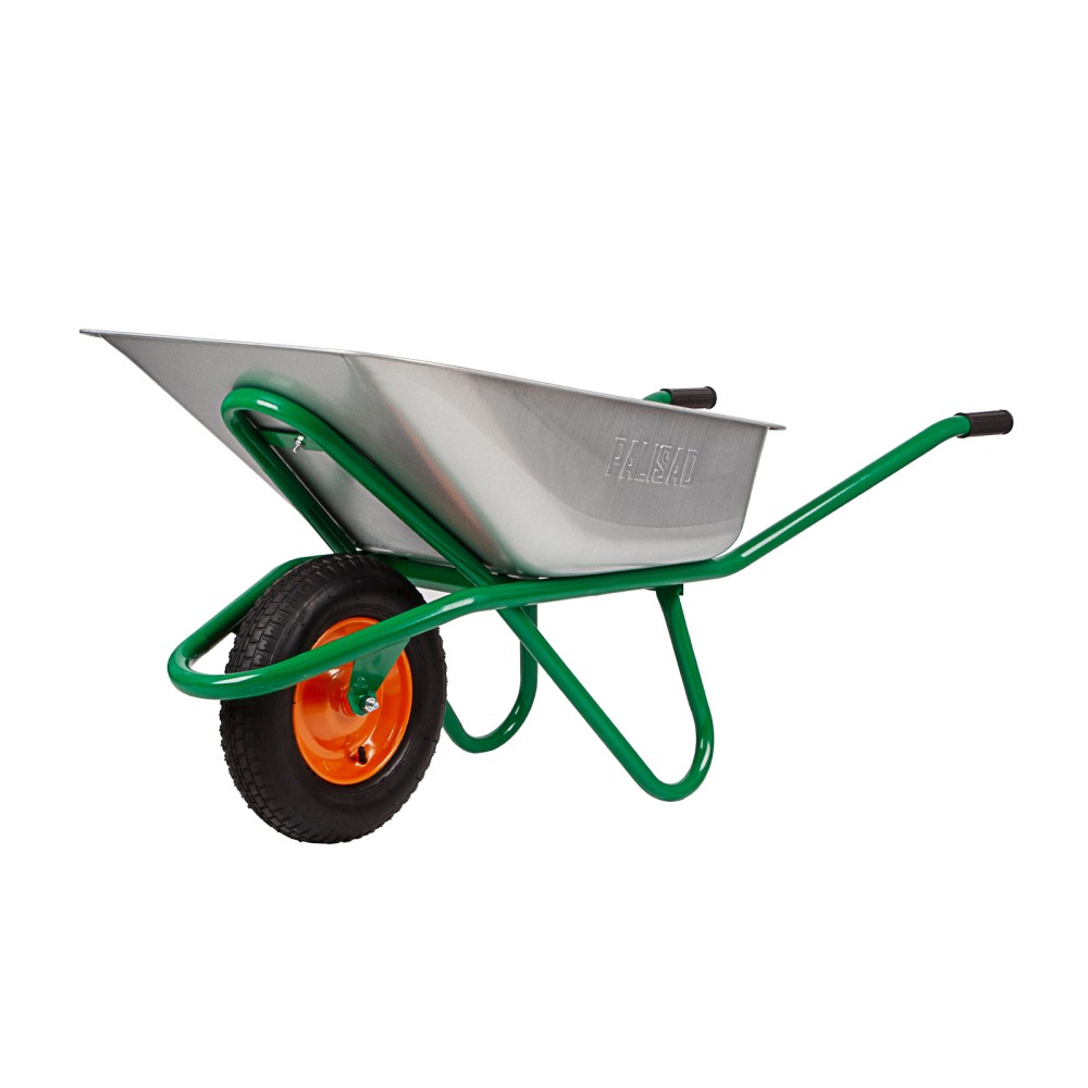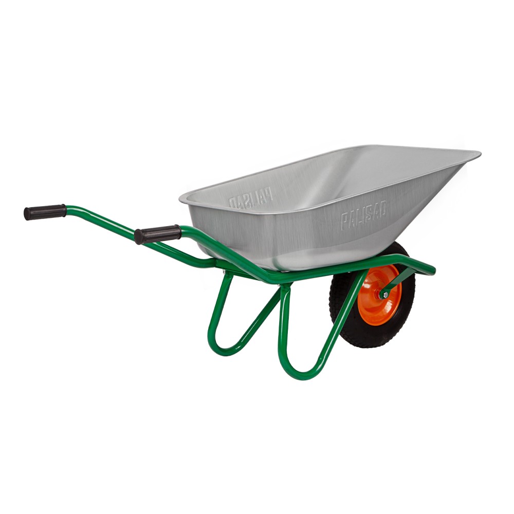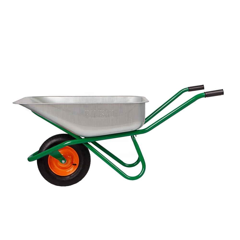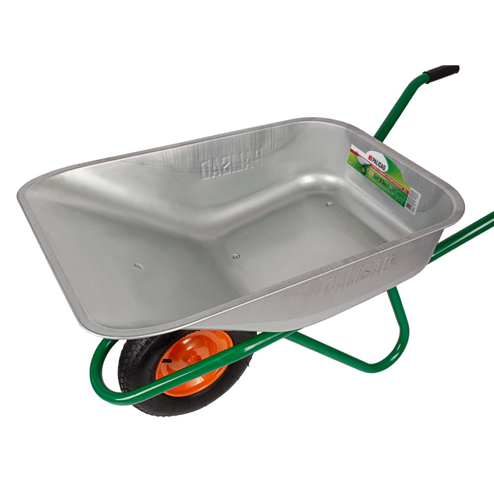Усиленная садово-строительная тачка Palisad 689183 с кузовом объемом 90 л и грузоподъемностью 200 кг позволяет транспортировать строительные материалы, удобрения, урожай и другие грузы. Рассчитана на интенсивную эксплуатацию, подходит для выполнения большого объема работ. Тачка используется в строительстве и сельском хозяйстве.ПреимуществаУвеличенная прочность — рама выполнена из стальных труб диаметром 32 мм и толщиной 1,2 мм, а кузов — из стали толщиной 0,7 мм.Надежность — завальцованные борта обеспечивают ударостойкость верхнего края кузова.Защита от коррозии — кузов оцинкован, а на раму, опору и диск колеса нанесено порошковое покрытие.Маневренность и хорошая проходимость — тачку с одним пневматическим колесом на 2-х шариковых подшипниках удобно перемещать и разворачивать. Высокая грузоподъемность — благодаря дополнительной опоре кузов выдерживает до 200 кг.Удобная фронтальная разгрузка — в конструкции тачки предусмотрен передний упор.Ремонтопригодность — изношенное колесо можно заменить, совместимые артикулы 68947, 68978.
