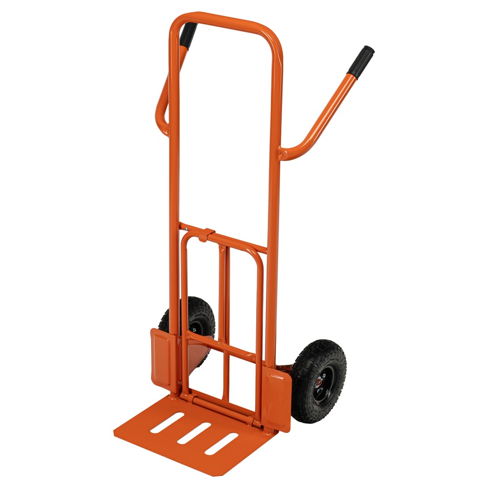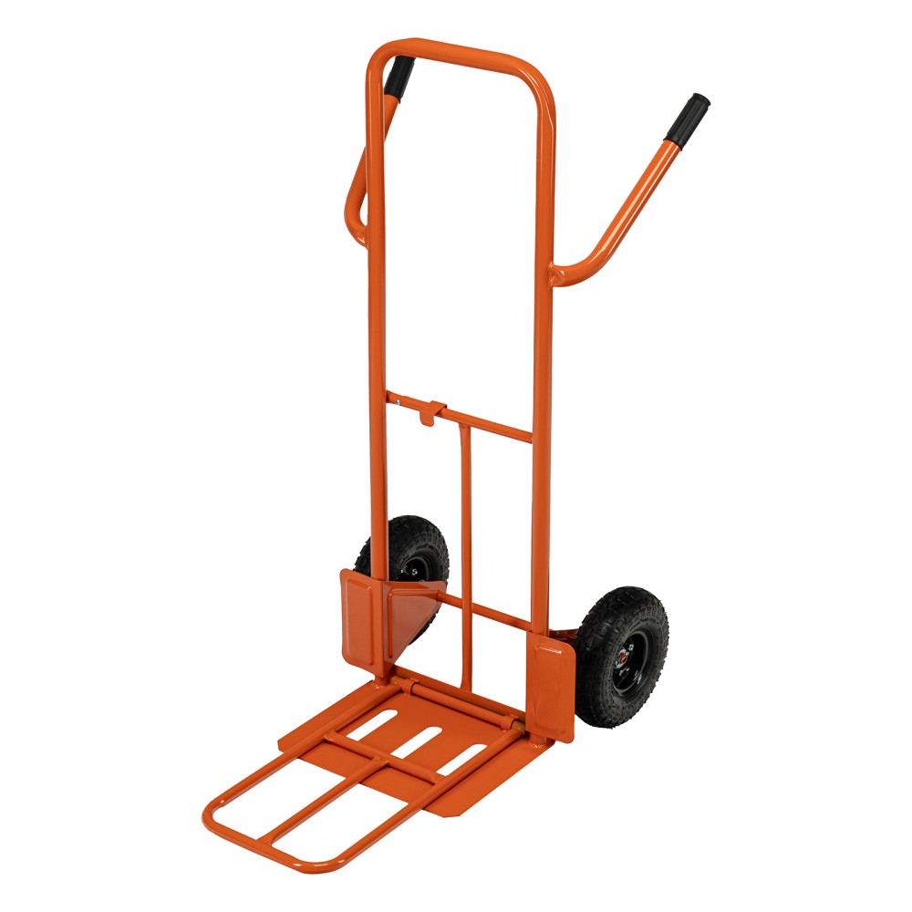Ручная 2-колесная тележка Сибртех TTP2-01.00.000 68944 грузоподъемностью 190 кг, с пневматическими колесами диаметром 260 мм и платформой размером 580 х 290 мм, используется для перемещения крупных грузов массой до 190 кг. Стальная рама с толщиной стенок 1,2 мм обеспечивает прочность конструкции. Тележка пригодится для работы на складе или на производстве.ПреимуществаДополнительные возможности — откидная платформа позволяет разместить на тележке груз с увеличенными габаритами.Долговечность — стальная рама покрыта порошковой эмалью для защиты от коррозии.Эргономичность — изогнутые назад ручки обеспечивают удобство перемещения тележки, а также могут служить упорами при горизонтальной погрузке.Ремонтопригодность — колеса можно заменить при необходимости, совместимый артикул 68970.Удобная транспортировка груза — пневматические колеса с камерами, резиновыми шинами и 2 шарикоподшипниками в каждом гасят вибрации и обеспечивают плавность хода.