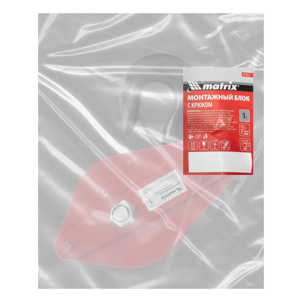 Монтажный блок Matrix 51921 с крюком, грузоподъемностью 0,5 т, расширяет функциональные возможности ручного и электрического грузоподъемного оборудования. Позволяет менять направление движения груза, а также увеличивает подъемную силу.ПреимуществаПродуманная конструкция — откидная щека удобна для установки троса или каната.Безопасная работа — кованая предохранительная защелка на крюке обеспечивает надежную фиксацию груза.Широкие возможности использования — блок пригодится для выполнения погрузочно-разгрузочных и монтажных работ на стройке, производстве и т.д.