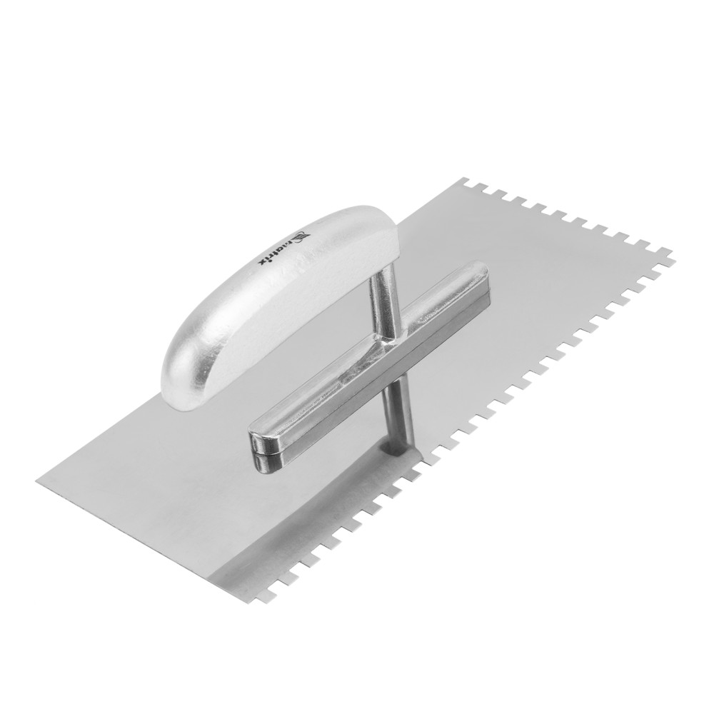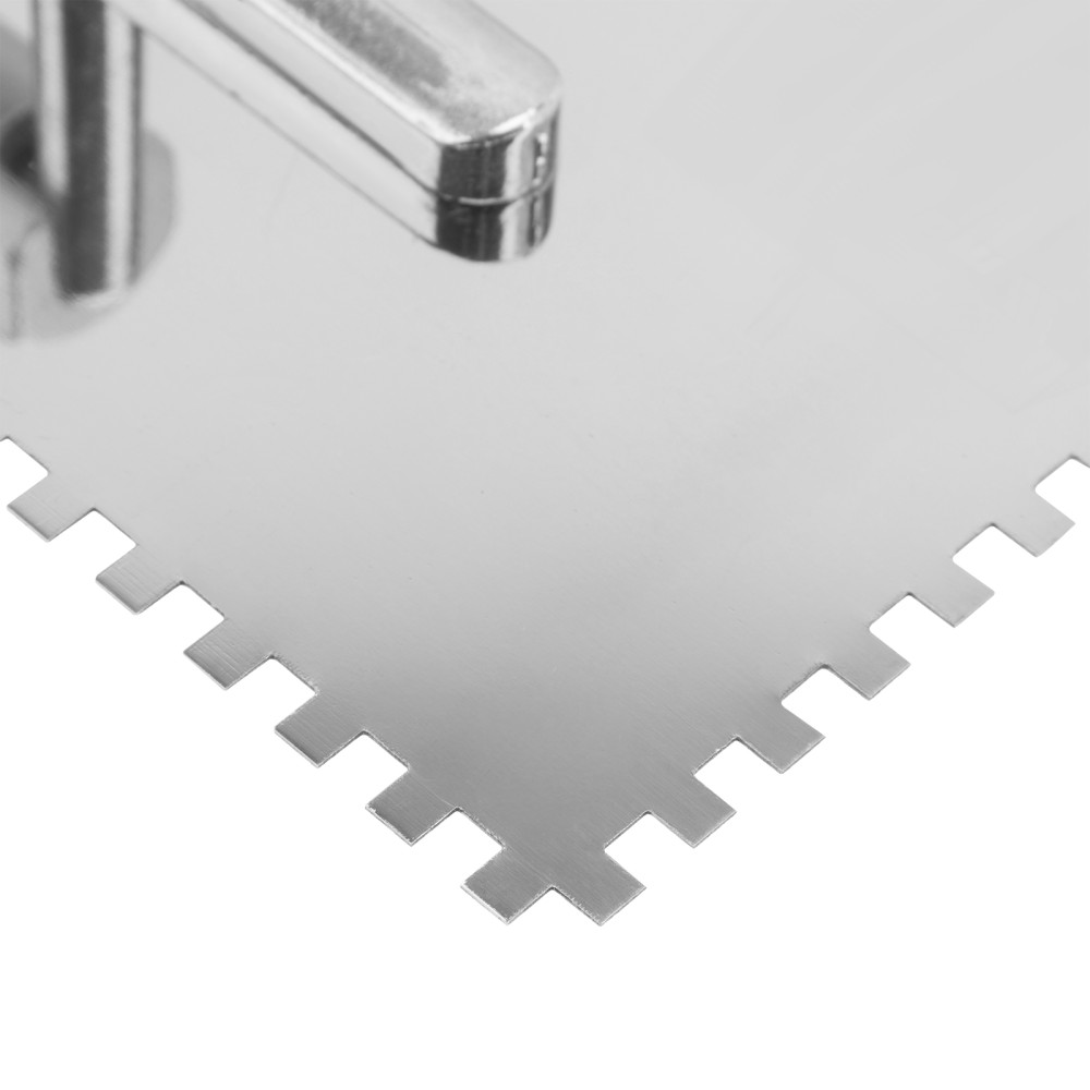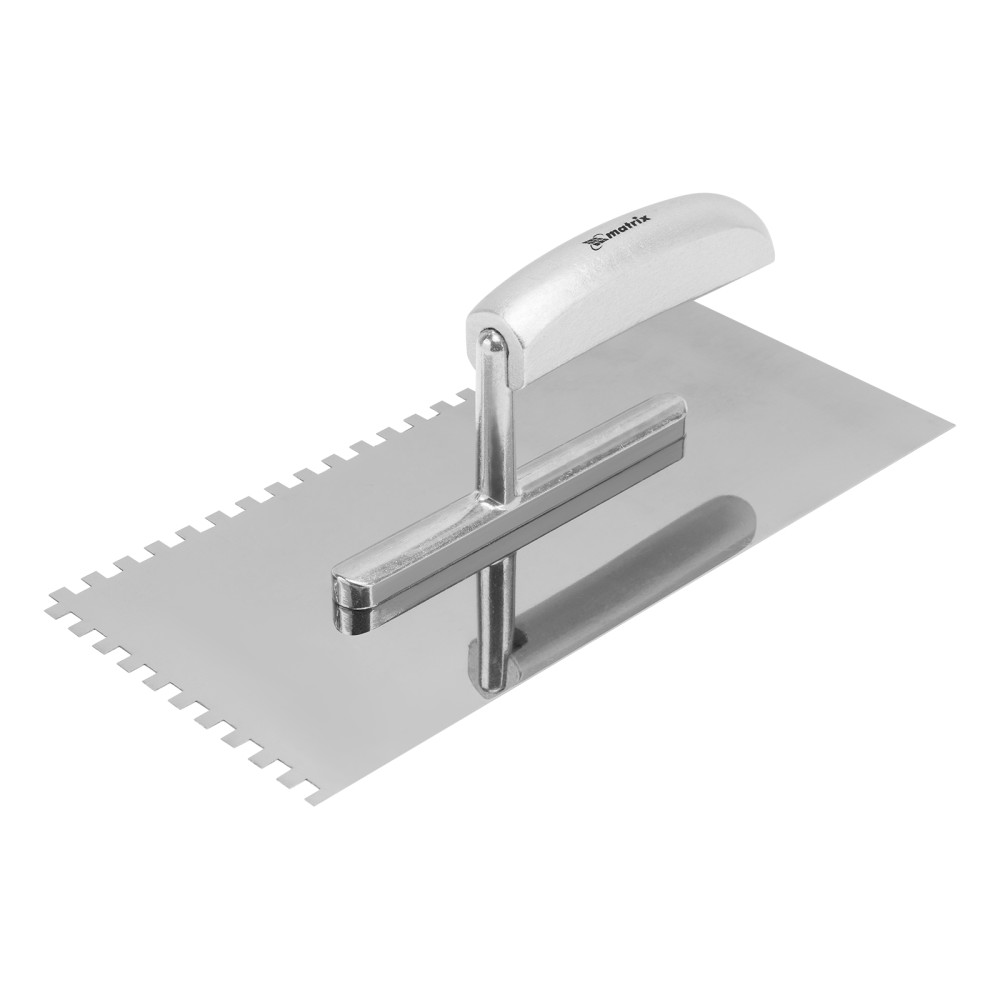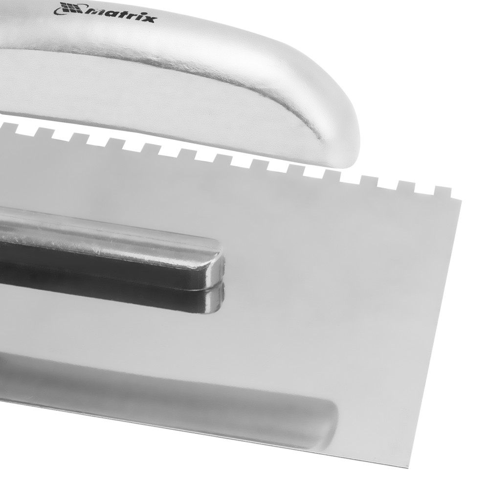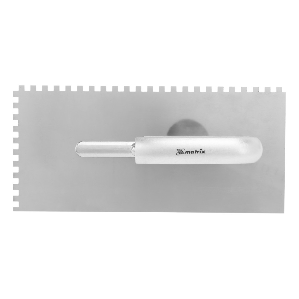 Гладилка Matrix 86737 размером 280 x 130 мм, с зубьями 6 х 6 мм, из нержавеющей стали, с деревянной ручкой, позволяет ровным слоем наносить на поверхности штукатурку и клеевые растворы. Зеркальная полировка снижает риск прилипания материала к полотну, благодаря чему покрытие получается идеально гладким.ПреимуществаУстойчивость к износу и коррозии — рабочее полотно изготовлено из нержавеющей стали.Эргономичность — деревянная ручка обеспечивает удобный захват и не выскальзывает из ладони.Габариты 280 x 130 мм — гладилка оптимальна для обработки больших поверхностей.