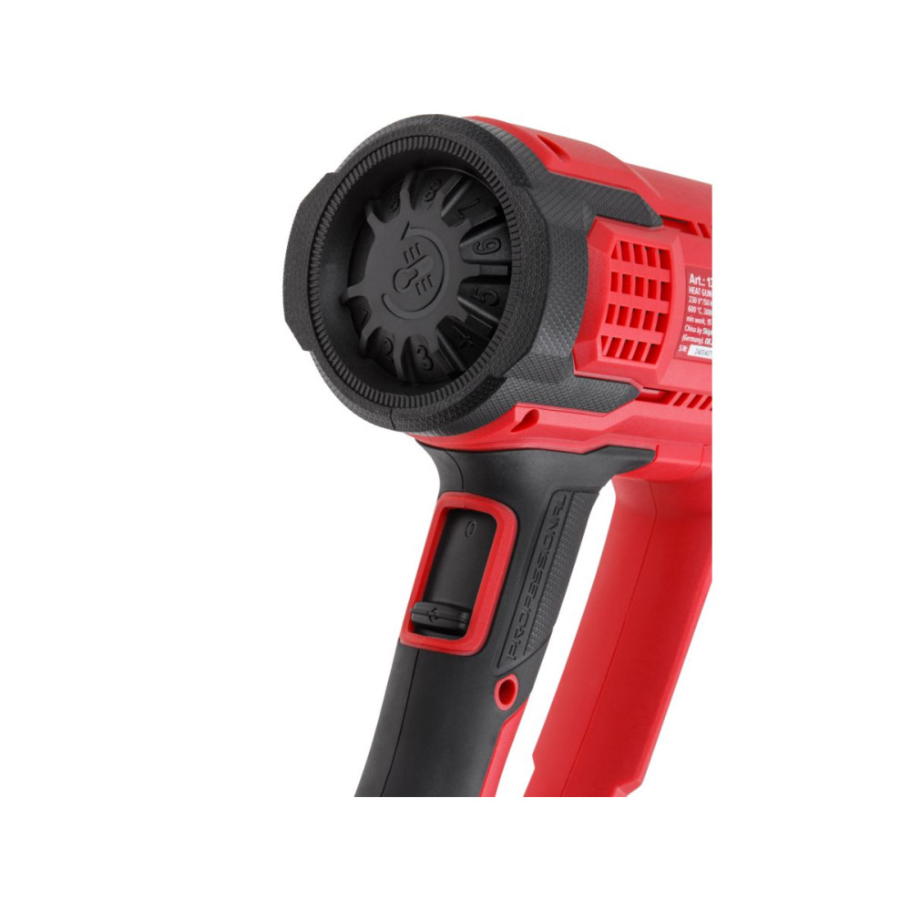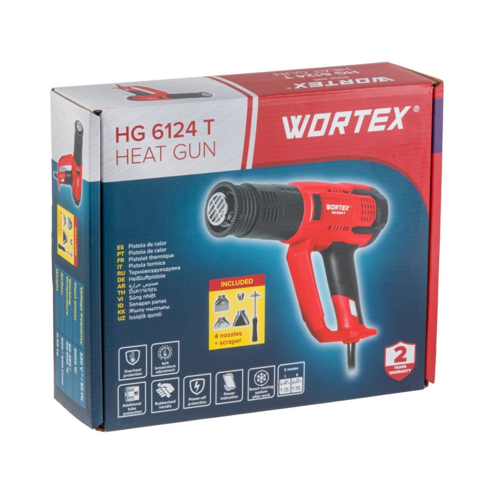 Данное многофункциональное устройство применяется как для снятия краски с поверхностей, придания формы изделиям из пластика, удаления клеевого слоя, а также выполнения и других задач. Модель обладает двухступенчатой регулировкой потока воздуха, а также плавной регулировкой температуры. На данной модели строительного фена присутствует защитная спираль вокруг сопла, что обеспечит дополнительную защиту во время работы. Имеется индикация подключения инструмента к сети. При необходимости можно менять форму Д-образной рукоятки (обладает обрезиненным покрытием). Возможно стационарное использование. Имеется защита от перегрева (т.е. при полной блокировке сопла , нагревательный элемент перестает работать, а вентиляторы охлаждения продолжают работу). Модель HG 6124 T обладает функцией защиты от непреднамеренного выключения электричества, а также функцией продувки после выключения для сохранения ресурса инструмента, а также более быстрого охлаждения.