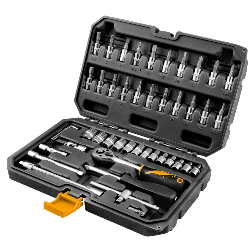 Материалы – сталь Cr-V, сталь S2 (биты), конструкционная сталь, хром, пластик PP, PP+TPR (рукояти), пластик PE-HD (кейс)