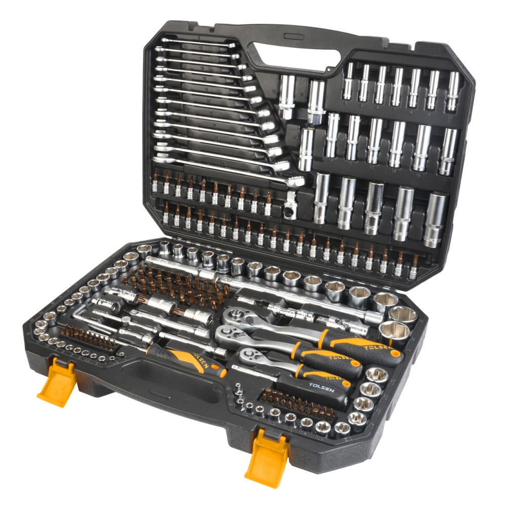 Материалы – сталь Cr-V, сталь S2 (биты), конструкционная сталь, хром, пластик PP, PP+TPR (рукояти), пластик PE-HD (кейс)