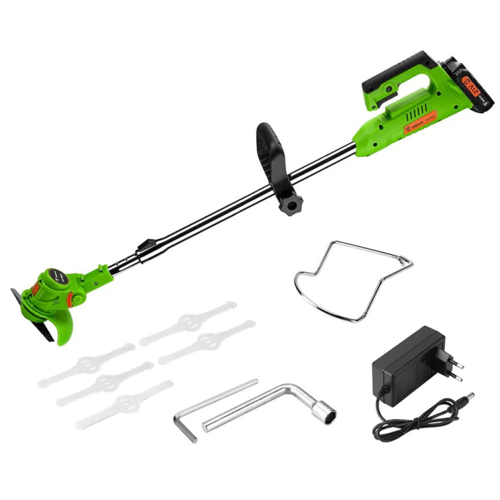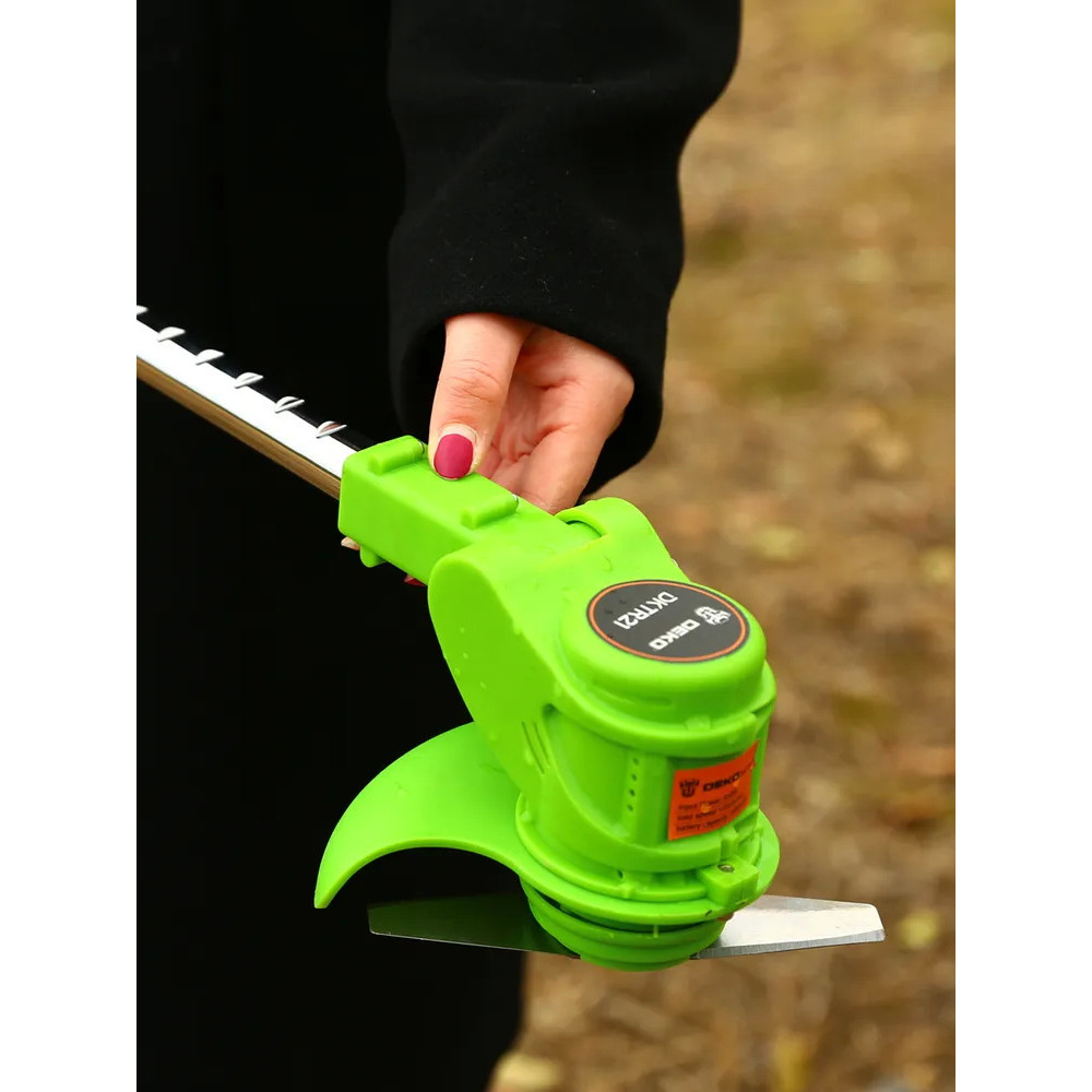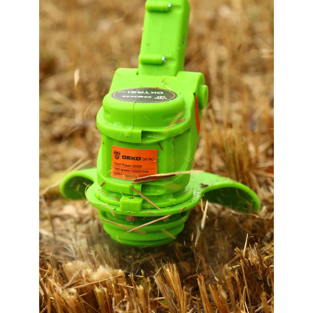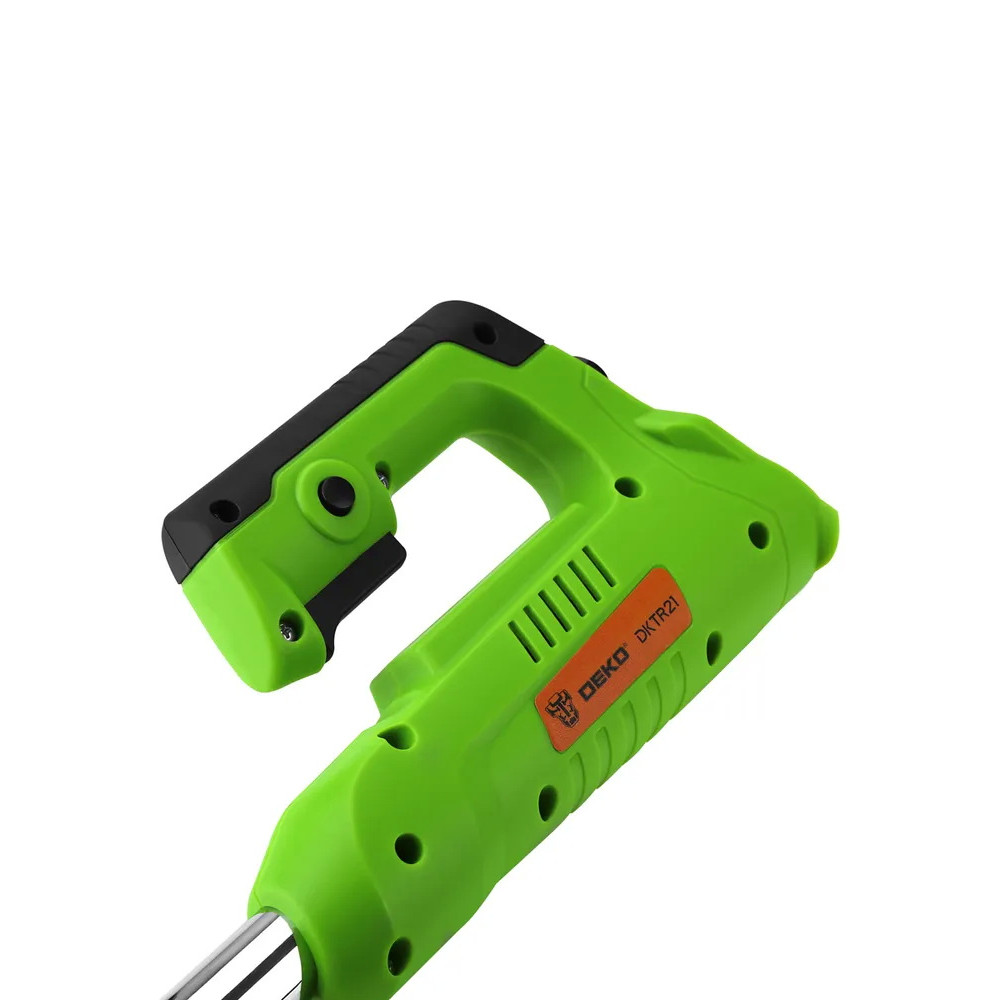 - Триммер садовый аккумуляторный DEKO DKTR21 - компактная модель, удобная для скашивания травы в труднодоступных местах, вдоль заборов, клумб, подравнивания газонов, краев садовых дорожек.