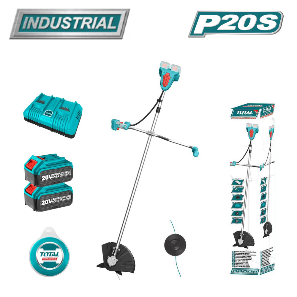 - Триммер-кусторез TOTAL TSTLI202521 входит в линейку инструментов TOTAL P20S и совместим со всеми аккумуляторами TOTAL 20В - TFBLI20011, TFBLI2002, TFBLI