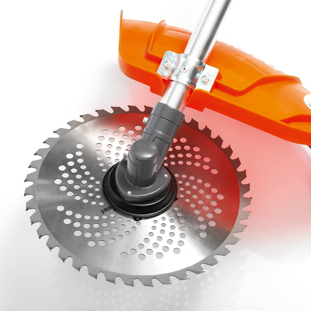 - Режущий диск изготовлен из высокопрочной стали с твердосплавными напайками. 40 зубьев позволяют использовать его для кошения жесткой травы, кустарника и тонких стволов деревьев.