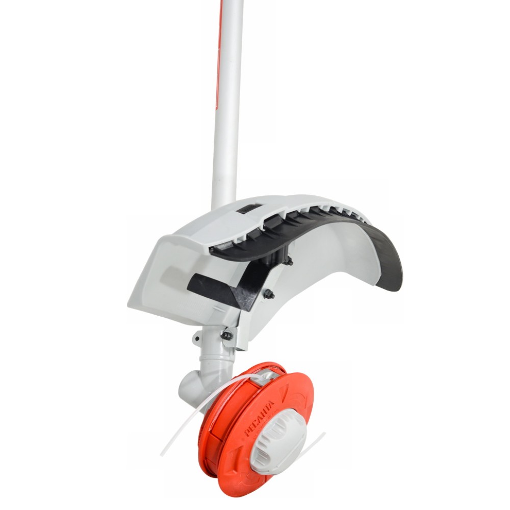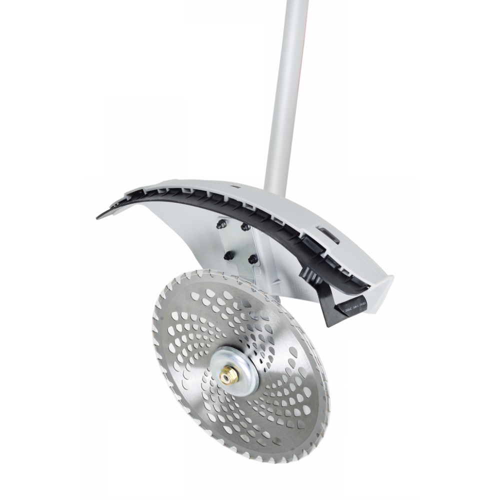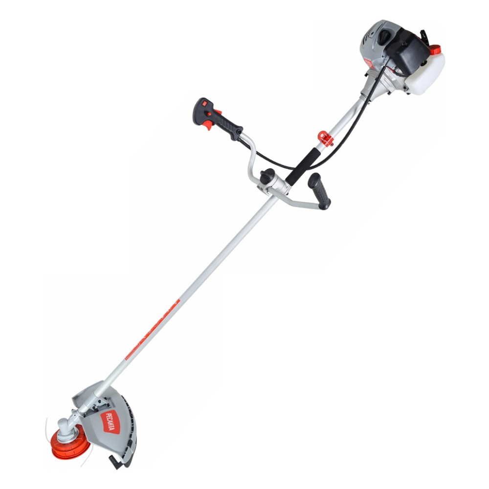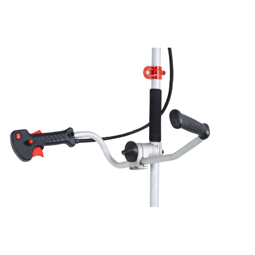 - На приводную штангу бензотриммера устанавливается трубчатая конструкция с двумя рулевыми рукоятками. Зажим рулевой скобы позволяет регулировать ее наклон относительно штанги. На рукоятку скобы вынесены органы управления работой триммера: курок «газа», для управления оборотами, и кнопка остановки двигателя. Курок имеет блокирующую защиту, исключающую случайное нажатие и кнопку фиксации в нажатом состоянии.