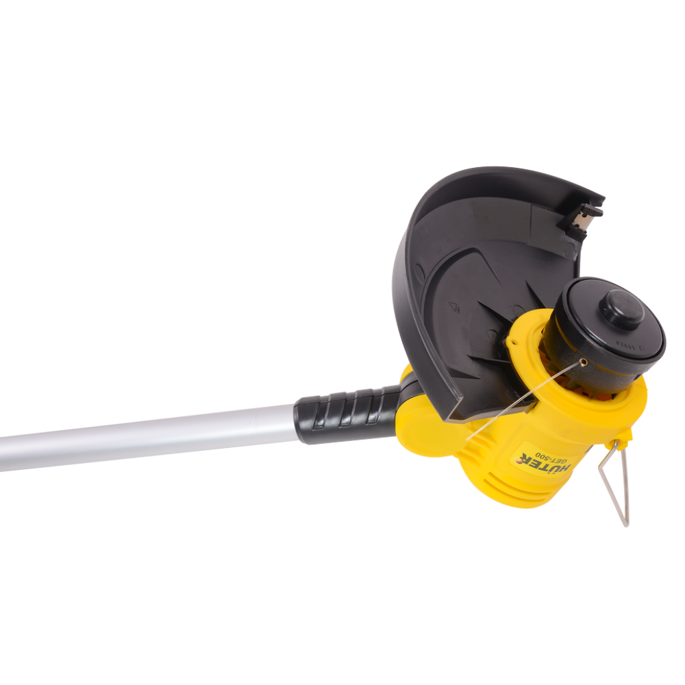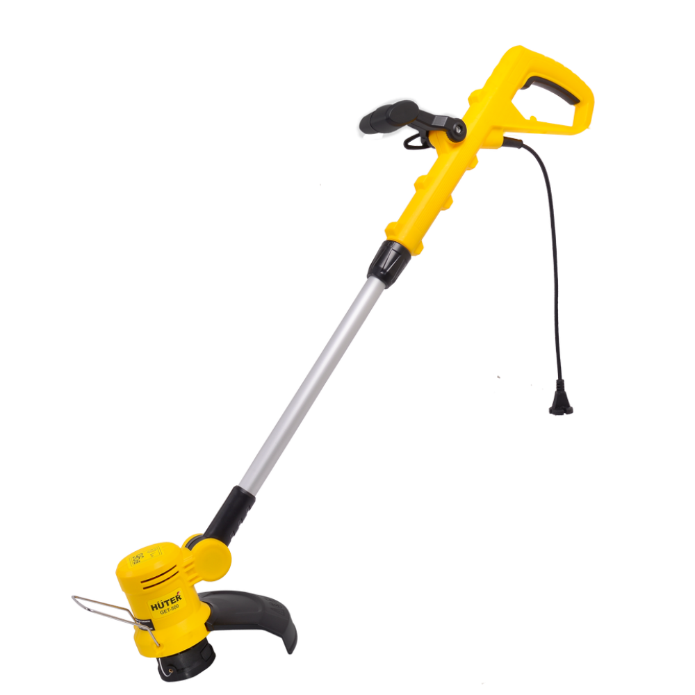 - Huter GET-500 — это электрический триммер для выравнивания газонной травы в труднодоступных местах. Инструмент оборудован двигателем мощностью 500 Вт, расположенным в нижней части оборудования. Это позволяет передавать крутящий момент двигателя напрямую на режущую леску. Однако, нижнее расположение двигателя не позволяет косить влажную траву и устанавливать нож. Поэтому модель не подходит для кошения порослей кустарников и сухостоя с толстыми стеблями.