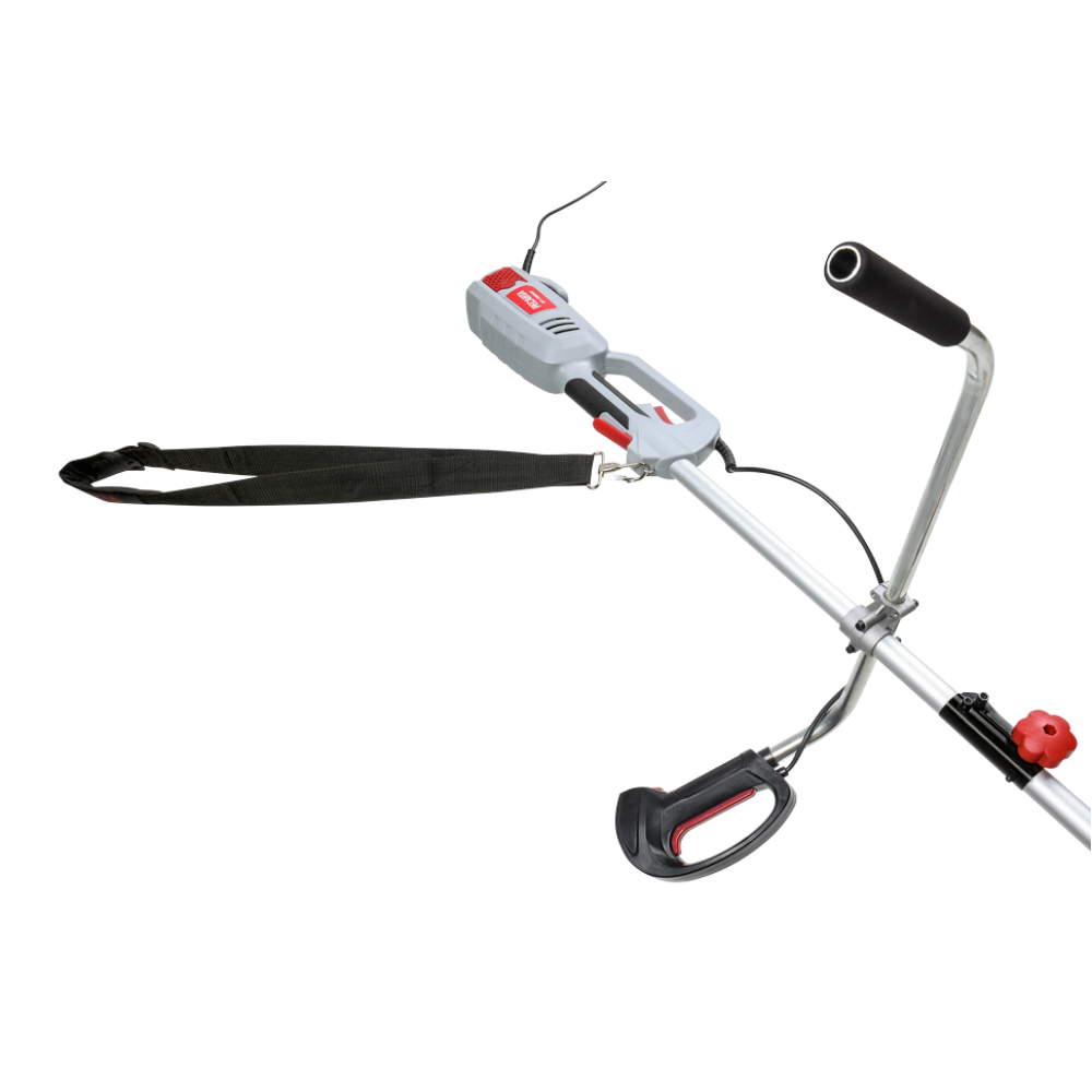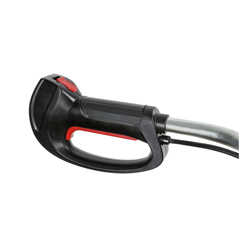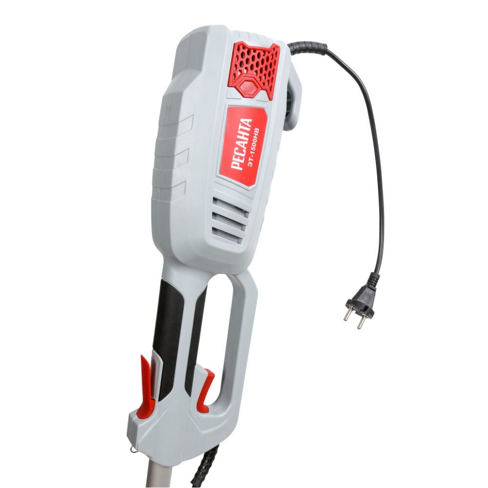 - Электрический триммер Ресанта ЭТ-1500НВ с расположенным в верхней части двигателем работает от сети. Для комфортной работы без резких рывков он оснащён системой плавного пуска. Максимальная ширина кошения электротриммером составляет 42 см за один проход. Его режущий механизм состоит из прочной лески (нейлон), диаметр которой составляет 2 мм, или сменного ножа 40ТР с напайками из твёрдосплавного победита. Леска подходит для кошения мягкой газонной травы, нож нужен для срезания сухостоя или древесной поросли.