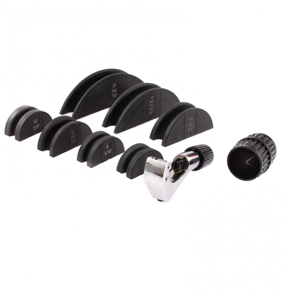 - В комплект входит 7 насадок, которые позволяют сгибать трубы диаметром 6-22 мм и толщиной стенок до 1 мм.