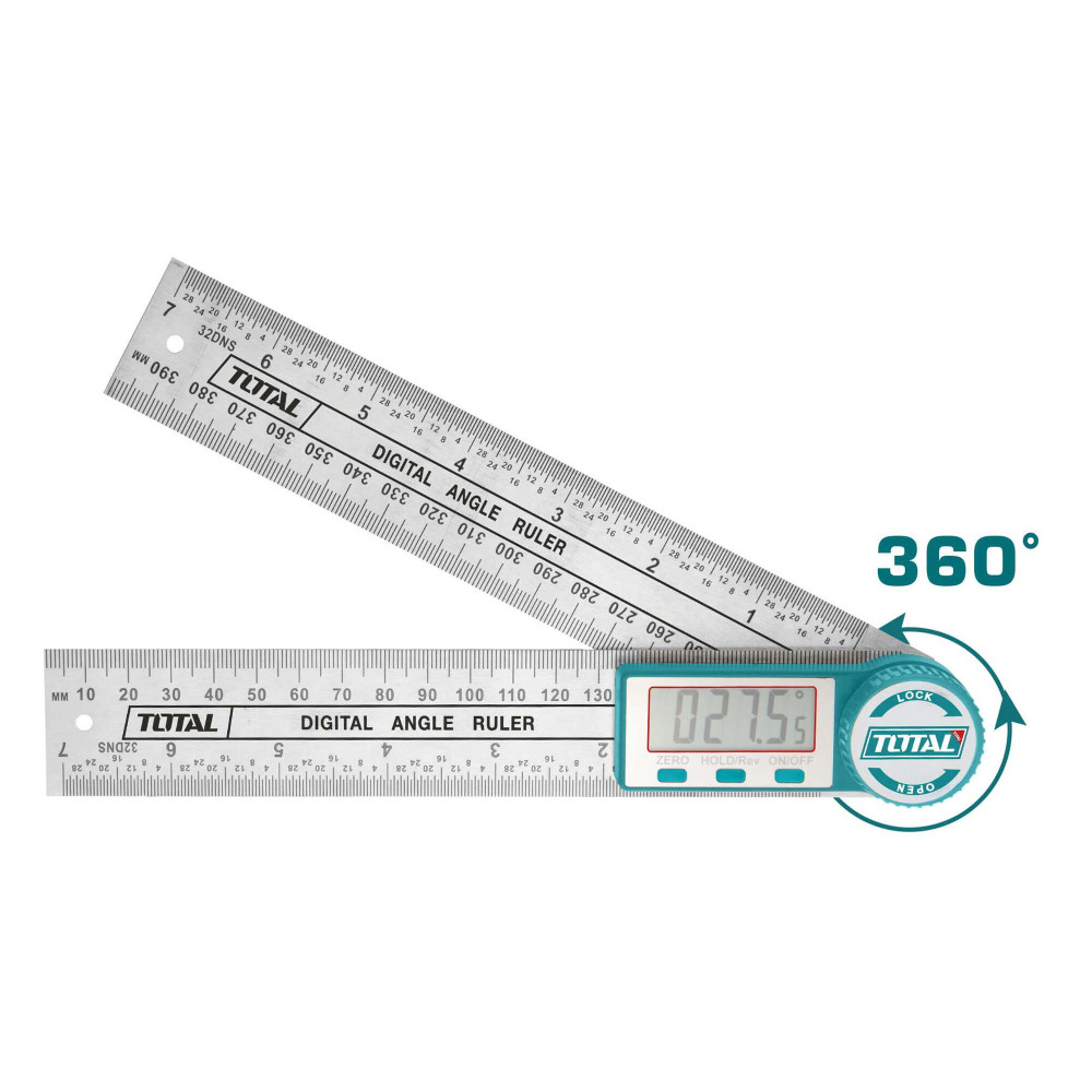 - С помощью измерителя углов цифрового TOTAL TMT333601 получают значение угла при строительных и ремонтных/отделочных работах в пределах 0…360 гр.