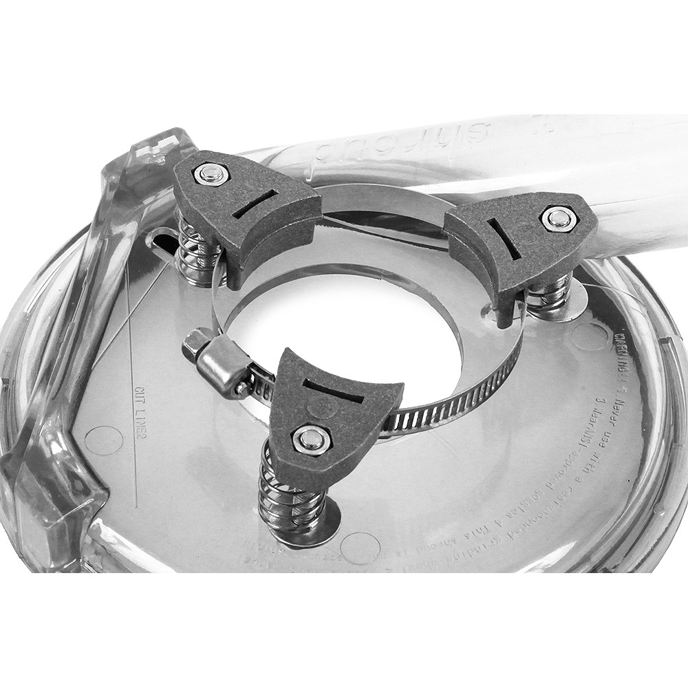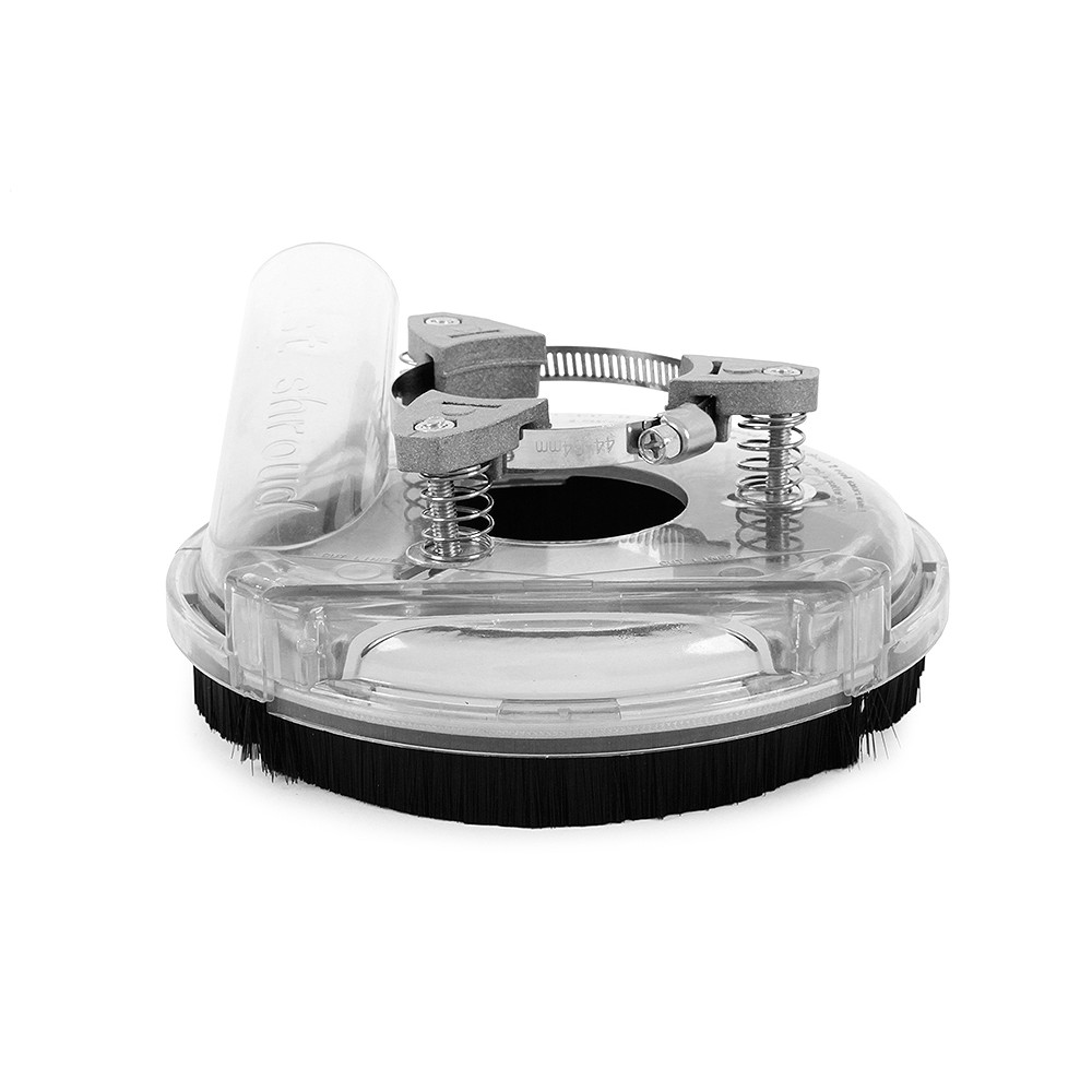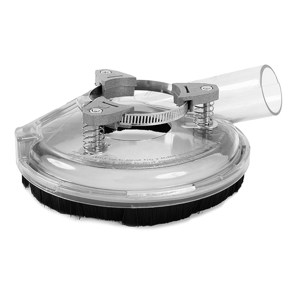 Кожух имеет прозрачный пластиковый корпус и крепится к инструменту с помощью хомутового зажима. Щеточное уплотнение по длине окружности кожуха препятствует разлету пыли. Используется при работе алмазными шлифовальными чашками и алмазными гибкими шлифовальными кругами (АГШК). Съемный сегмент кожуха позволяет подобраться инструментом к труднодоступным местам и минимизировать т.н. «мертвую зону» обрабатываемой поверхности..