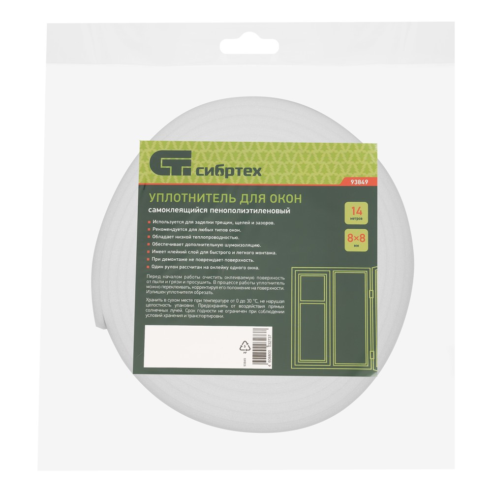 Самоклеящийся уплотнитель для окон Сибртех 93849 размером 8 мм х 8 мм х 14 м обеспечивает тепло- и шумоизоляцию, предотвращает образование сквозняков, попадание пыли. Может использоваться в жилых, производственных и иных помещениях.ПреимуществаДолговечность — уплотнитель из высококачественного пенополиэтилена (ППЭ) устойчив к влаге, старению и воздействию окружающей среды.Удобное использование — установка уплотнителя не занимает много времени.Эффективность в любое время года — изделие сохраняет рабочие свойства при широком диапазоне температур.