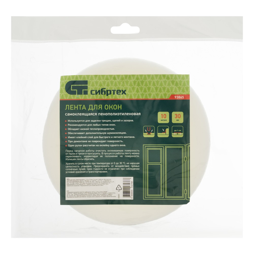 Самоклеящаяся лента для окон и дверей Сибртех 93865 шириной 30 мм и длиной 10 м используется для тепло- и звукоизоляции квартиры, офиса, магазина и других помещений. Позволяет предотвратить образование сквозняков, попадание пыли и грязи.ПреимуществаВысокие адгезивные свойства — лента надежно фиксируется на металлических, пластиковых и деревянных поверхностях.Влагостойкость — уплотнитель практически не подвержен гниению и плесени, не отклеивается при попадании воды.Эластичность — утеплитель легко меняет и восстанавливает форму, не мешая окнам закрываться и открываться.Неприхотливость — уплотнитель сохраняет свои свойства при температуре от -50 до +45 °C.Экономичность — изделие выполнено из недорогого, но качественного материала — пенополиэтилена.Простая установка — лента быстро приклеивается и отклеивается без дополнительных инструментов.