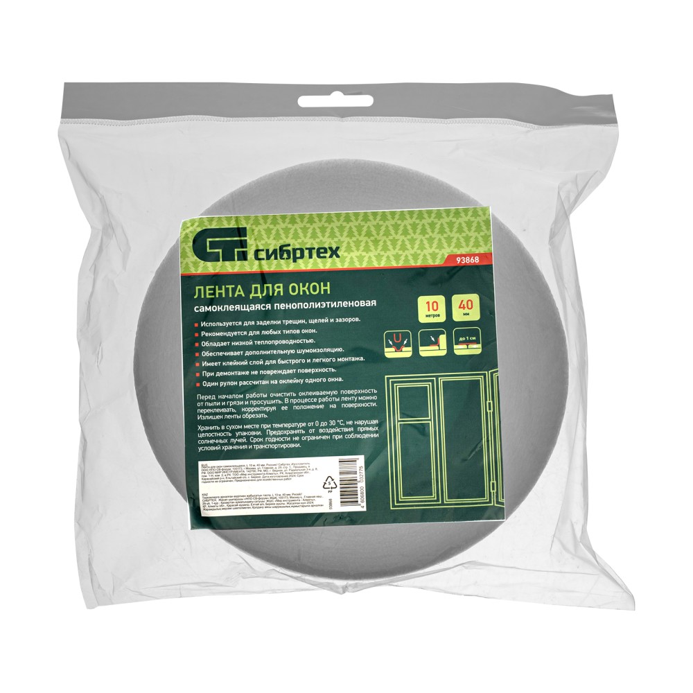 Самоклеящаяся лента для окон и дверей Сибртех 93868 шириной 40 мм и длиной 10 м используется для тепло- и звукоизоляции квартиры, офиса, магазина и других помещений. Позволяет предотвратить образование сквозняков, попадание пыли и грязи.ПреимуществаВысокие адгезивные свойства — лента надежно фиксируется на металлических, пластиковых и деревянных поверхностях.Влагостойкость — уплотнитель практически не подвержен гниению и плесени, не отклеивается при попадании воды.Эластичность — утеплитель легко меняет и восстанавливает форму, не мешая окнам закрываться и открываться.Неприхотливость — уплотнитель сохраняет свои свойства при температуре от -50 до +45 °C.Экономичность — изделие выполнено из недорогого, но качественного материала — пенополиэтилена.Простая установка — лента быстро приклеивается и отклеивается без дополнительных инструментов.
