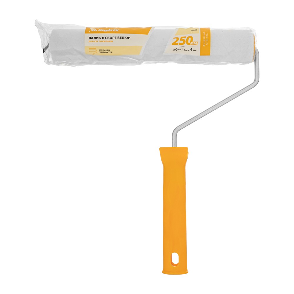 Валик Matrix «ВЕЛЮР» 80889 шириной 250 мм и диаметром 36 мм, с двухкомпонентной ручкой, бюгелем 6 мм, ворсом 4 мм из шерсти и полиакрила, позволяет наносить материал тонким слоем, поэтому оптимален для работы с лаками. Благодаря коротковорсовой шубке является идеальным помощником во время финишной отделки полов и гладкой древесины. Полиакрил в составе шубки повышает формостойкость и устойчивость валика к воздействию агрессивных веществ, что позволяет использовать его со всеми типами ЛКМ.ПреимуществаВысокая производительность — свободно вращающийся валик обеспечивает максимально возможную отдачу ЛКМ на окрашиваемую поверхность.Легкий демонтаж — быстросъемная система облегчает подготовку к работе, очистку и замену ролика.Возможность интенсивной эксплуатации — шубка, приклеенная с использованием технологии Termofusion, не отслаивается от ролика.Равномерное окрашивание — края шубки обработаны и на ней нет шва, благодаря чему валик не оставляет следов на поверхности.Долговечность — оцинкованный бюгель не подвержен образованию коррозии.Удобное окрашивание больших участков — ширина валика составляет 250 мм, а диаметр — 36 мм.Комфортная работа — двухкомпонентная ручка обеспечивает удобный захват и не выскальзывает из ладони.