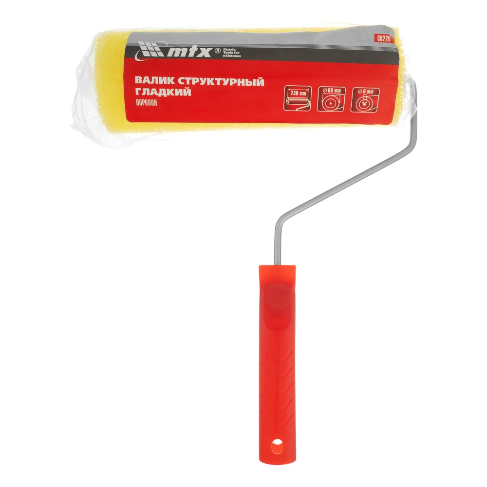 Структурный поролоновый валик MTX 80220 «гладкий» 230 мм с ручкой диаметром 6 мм, диаметром ролика 80 мм, предназначен для декоративной отделки стен, потолков, фасадов и других поверхностей. Он подходит для нанесения водно-дисперсионных фактурных красок, декоративной штукатурки, жидких материалов без содержания химических растворителей и щелочи. Небольшие отверстия в поролоновой шубке позволяют создать оригинальный узор на поверхности. Валик прост в применении и не требует владения профессиональными навыками.ПреимуществаЦилиндр валика изготовлен из прочного пластика, выдерживает интенсивные нажатия при создании узора.За счет ширины 230 мм валик подходит для обработки больших поверхностей, ускоряет процесс декорирования стен, фасадов и т.д.Ручка валика позволяет присоединить телескопический удлинитель для удобной работы на высоте и в труднодоступных местах.Поролоновая шубка легко поддается очистке от штукатурки и лакокрасочных материалов.