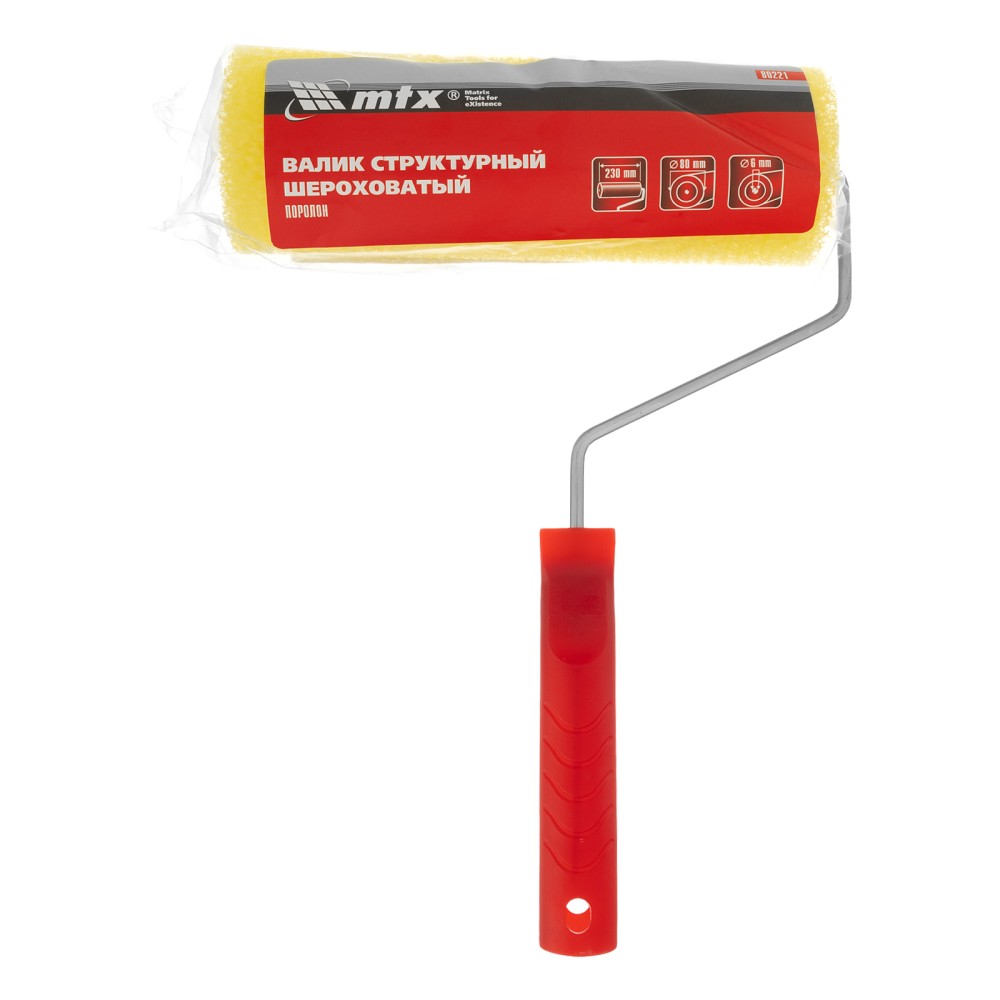 Структурный поролоновый валик MTX 80221 «шероховатый» 230 мм с ручкой диаметром 6 мм, диаметром ролика 80 мм, предназначен для декоративной отделки стен, потолков, фасадов и других поверхностей. Он подходит для нанесения водно-дисперсионных фактурных красок, декоративной штукатурки, жидких материалов без содержания химических растворителей и щелочи. Небольшие отверстия в поролоновой шубке позволяют создать оригинальный узор на поверхности. Валик прост в применении и не требует владения профессиональными навыками.ПреимуществаЦилиндр валика изготовлен из прочного пластика, выдерживает интенсивные нажатия при создании узора.За счет ширины 230 мм валик подходит для обработки больших поверхностей, ускоряет процесс декорирования стен, фасадов и т.д.Ручка валика позволяет присоединить телескопический удлинитель для удобной работы на высоте и в труднодоступных местах.Поролоновая шубка легко поддается очистке от штукатурки и лакокрасочных материалов.