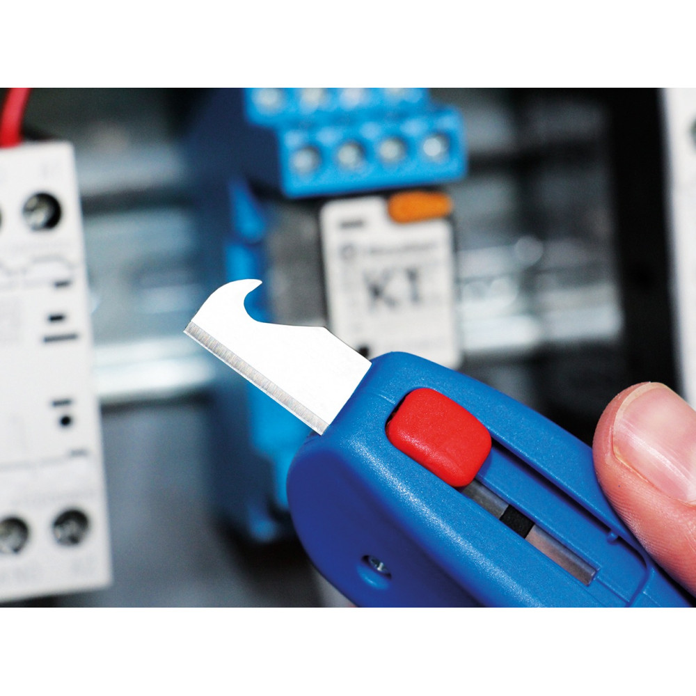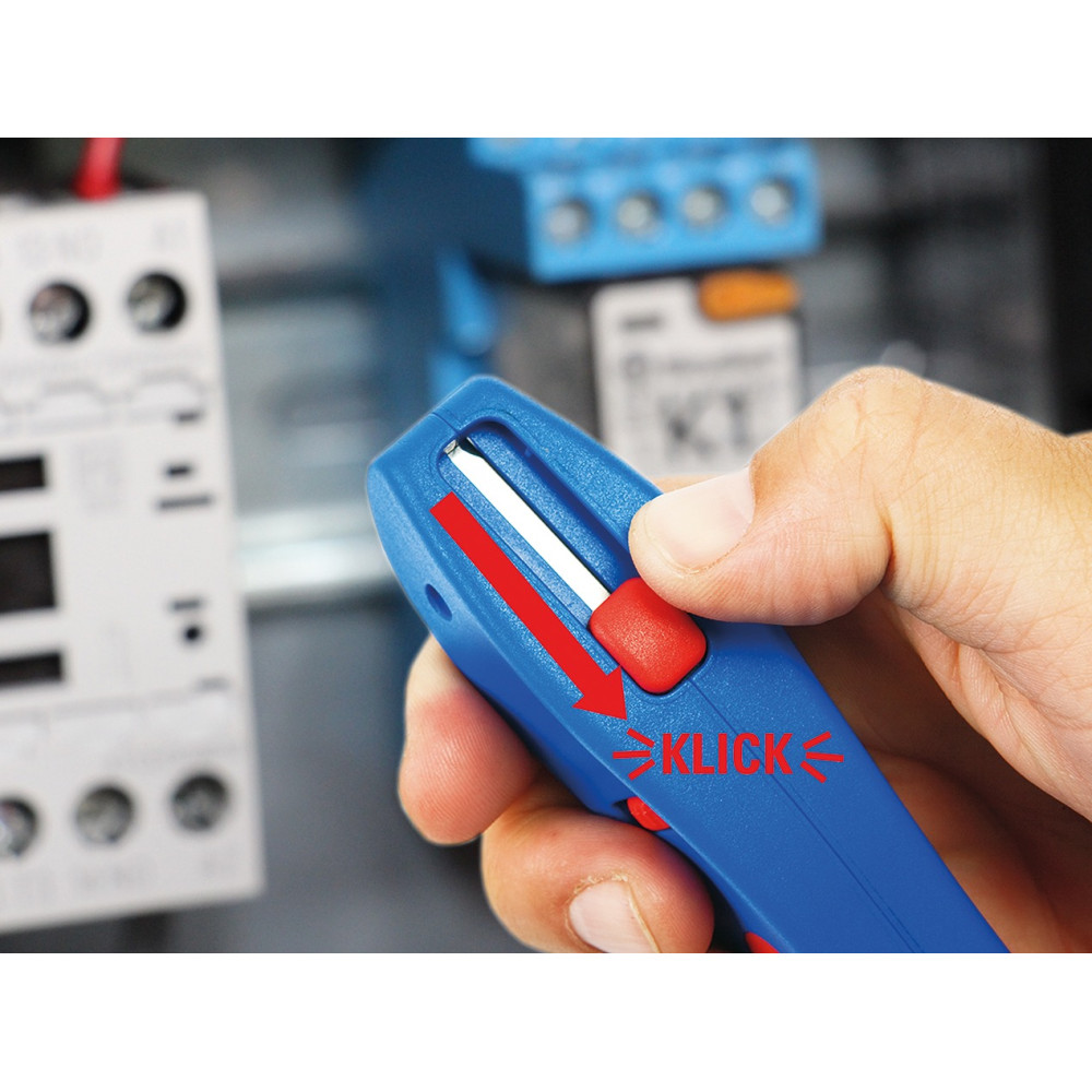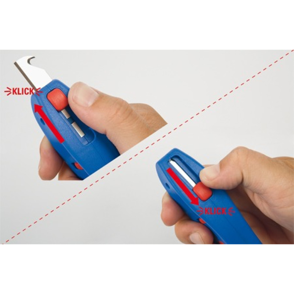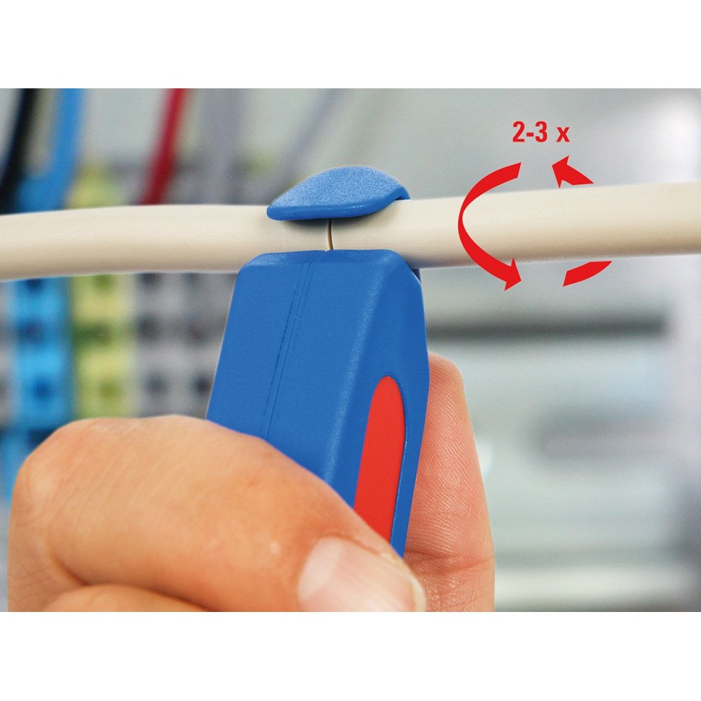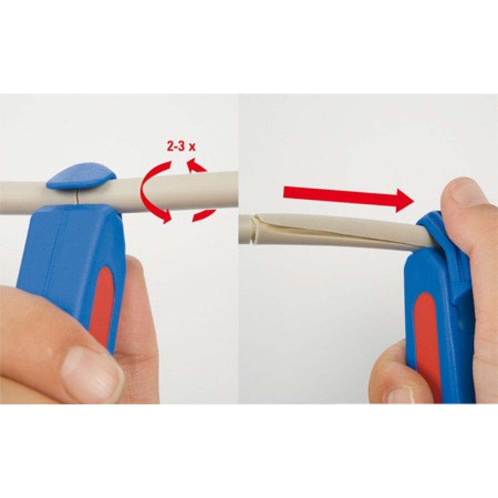 Новое поколение кабельных ножей WEICON с корпусом из высокопрочного пластика для точной и удобной работы. Серия кабельных ножей S 4 - 28 позволяет точно, быстро и безопасно снимать внешнюю оболочку всех стандартных круглых кабелей диаметром от 4 до 28 мм. Глубина реза оболочки может регулироваться с помощью специального колесика в корпусе. Это предотвращает повреждение кабеля внутри. Благодаря поворотному ножу возможна поперечная и продольная резка оболочки кабеля.