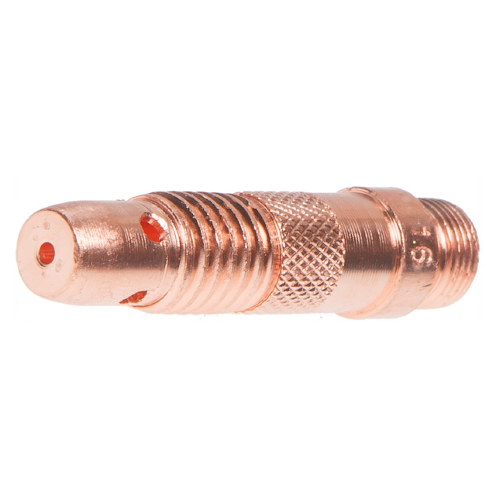 Зажим цанги является расходным элементом TIG горелки. Предназначен для фиксации электрода с цангой в TIG горелке. Отверстия на зажиме служат для распределения потока защитного газа.