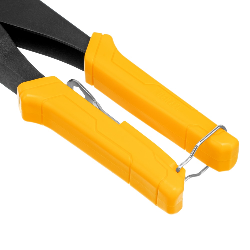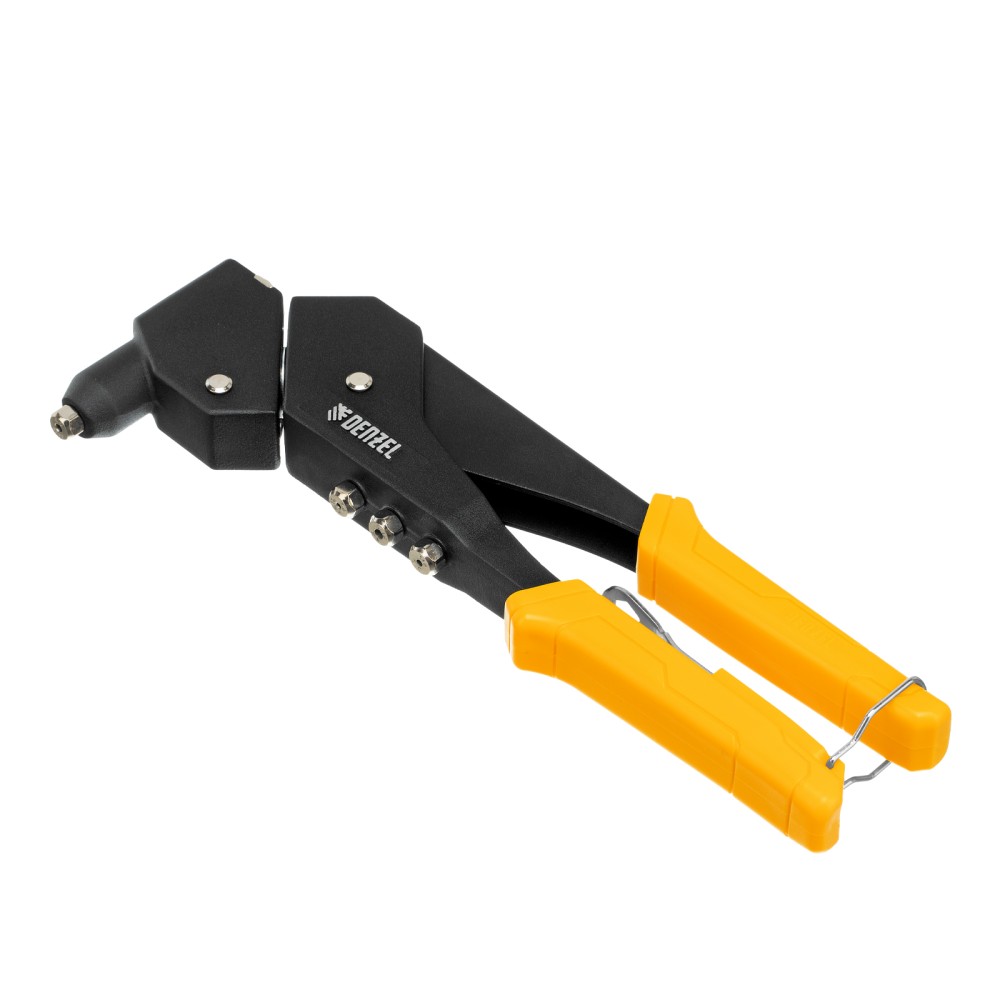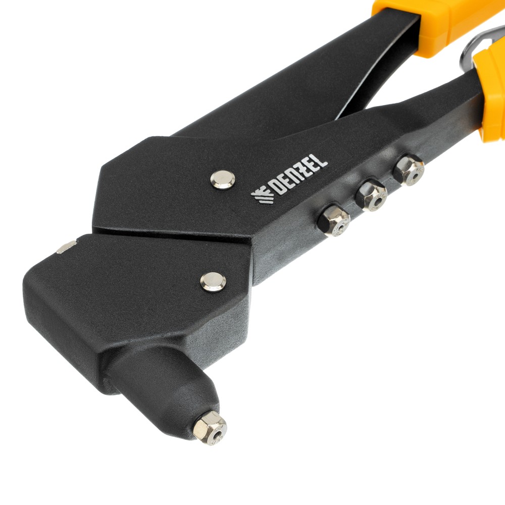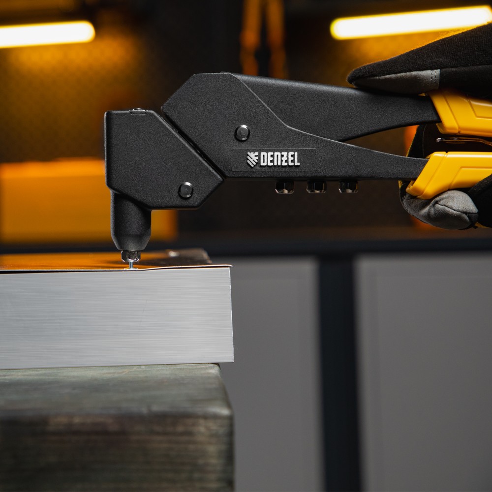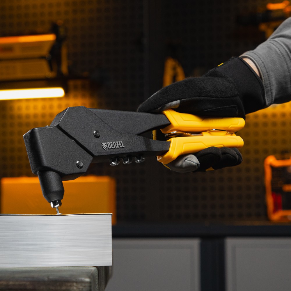 Заклепочник ручной литой Denzel 40442 длиной 285 мм, поворотный на 0-360°, используется для создания неразъемных соединений с помощью алюминиевых вытяжных заклепок диаметром 2,4-3,2-4,0-4,8 мм, стальных диаметром 2,4-3,2-4,0 мм и вытяжных заклепок из «нержавейки» диаметром 2,4-3,2 мм. Голова инструмента вращается на 360°, что упрощает работу в стесненных условиях. Заклепочник пригодится на производстве, в ремонтной мастерской, а также в быту.ПреимуществаПрочность и долговечность — корпус из алюминиевого сплава устойчив к механическим нагрузкам.Надежность — трехсегментный цанговый механизм из прочной стали 35Х крепко удерживает вытяжную шпильку заклепки.Безопасность — фиксатор рукоятки предотвращает случайное срабатывание инструмента во время транспортировки и позволяет сэкономить место для хранения.Готовность к работе — в комплект поставки включены сменные головки для заклепок разного размера и ключ для замены насадок.Продуманное хранение сменных насадок — головки крепятся на корпус, поэтому они всегда будут под рукой и не потеряются.Комфортная работа — эргономичные рукоятки с рельефной поверхностью надежно ложатся в руку.